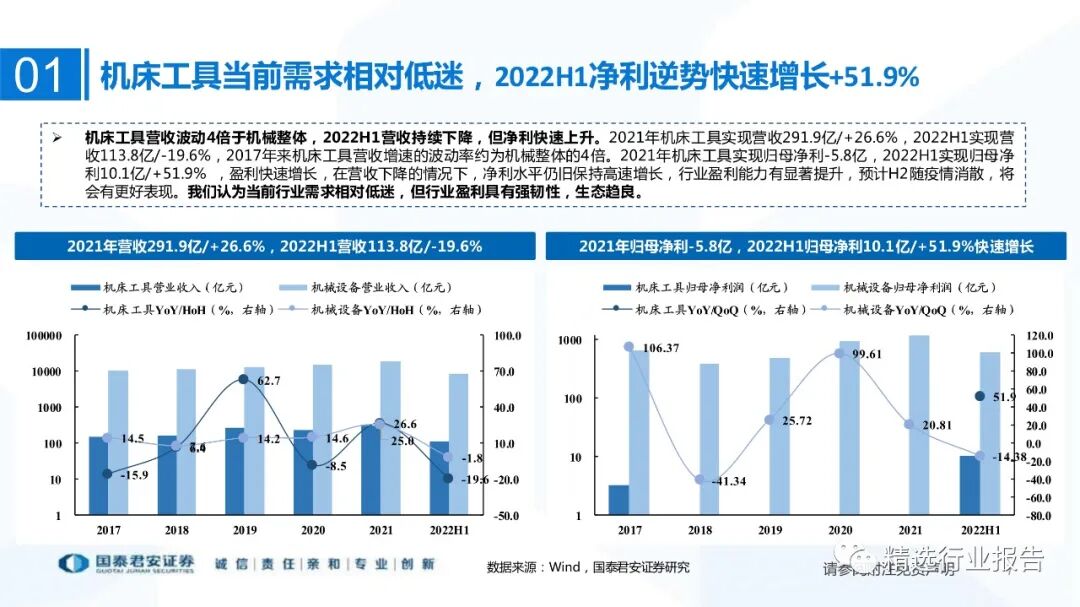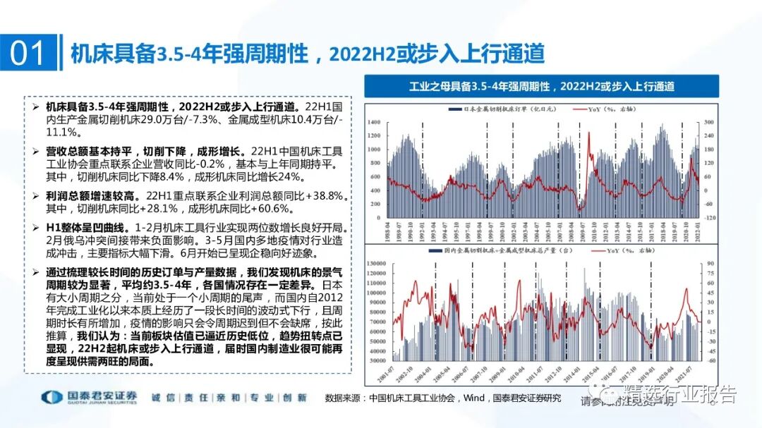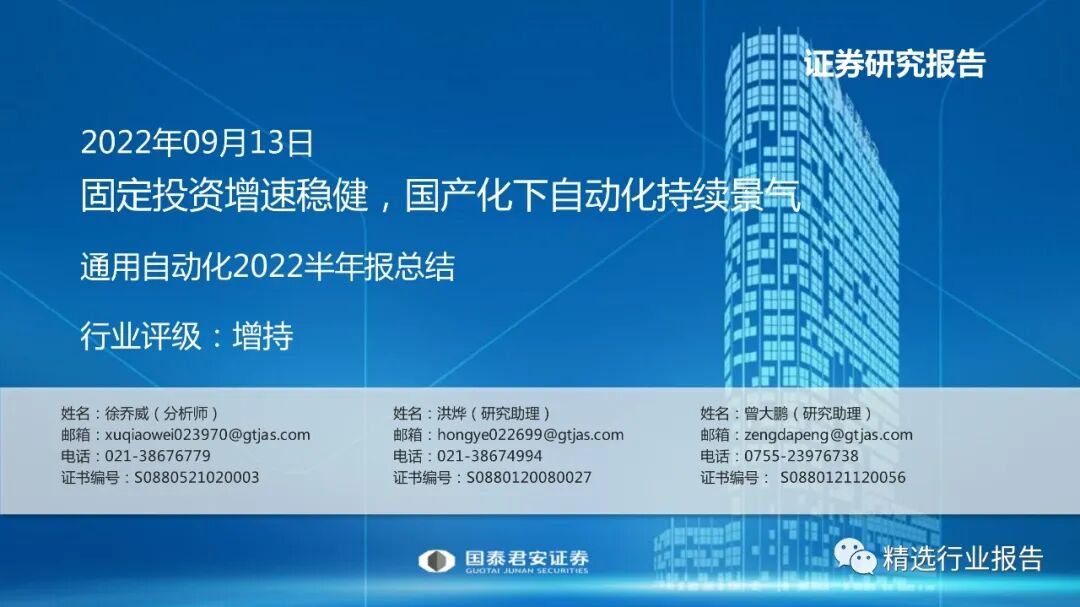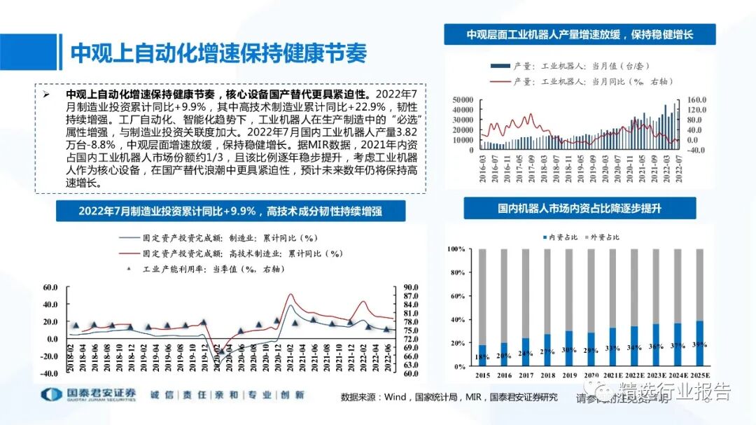 自动化:看好年内稳增长背景下的制造业回暖,核心设备国产替代更具紧迫性。2022年7月制造业投资累计同比+9.9%,其中高技术制造业累计同比+22.9%。工厂自动化、智能化趋势下,工业机器人在生产制造中的“必选”属性增强,与制造业投资关联度加大。疫情反复令市场对2022Q2制造业景气态度谨慎,我们看好年内稳增长背景下的制造业回暖。2022年H1国内工业机器人产量20.24万台/-11.2%;7月国内工业机器人产量3.82万台-8.8%,中观层面增速放缓,保持稳健增长。据MIR数据,2021年内资占国内工业机器人市场份额约1/3,且该比例逐年稳步提升,考虑工业机器人作为核心设备,在国产替代浪潮中更具紧迫性,预计未来数年仍将保持高速增长。