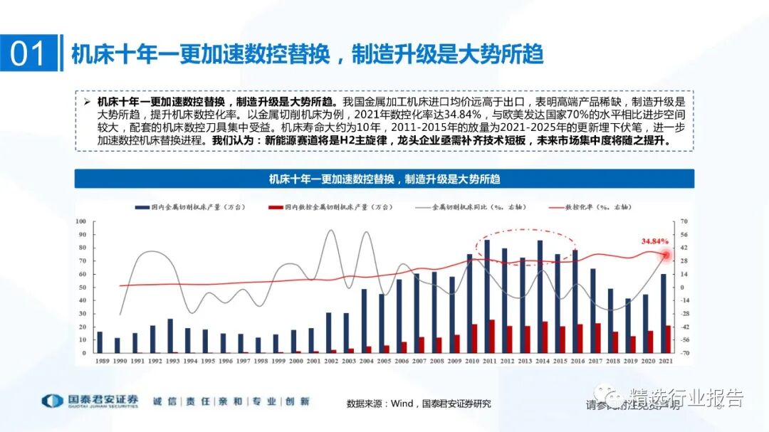 机床刀具:耗材属性熨平周期,国产刀具性能渐与日韩比肩。作为数控工业机床的“牙齿”,刀具性能决定了机床加工精度和效率。切削加工约占整个机械加工工作量的90%,刀具是制造领域中直接参与切削的终端关键部件。我们预计高效先进刀具可明显提高加工效率,使生产成本降低10%-15%。刀具具备易耗品的属性,在加工的时候几个小时更换一次,行业周期波动性弱。随着数控化率提升+国家制造业产业升级,我们认为中长期机床刀具的市场规模将持续增长。国产刀具总体上仍以中低端产品为主,高端领域基本受欧美、日韩企业控制,国产刀具主要在稳定性、精度、使用寿命等方面与进口刀具存在差距,内资企业紧抓优势细分向上渗透。