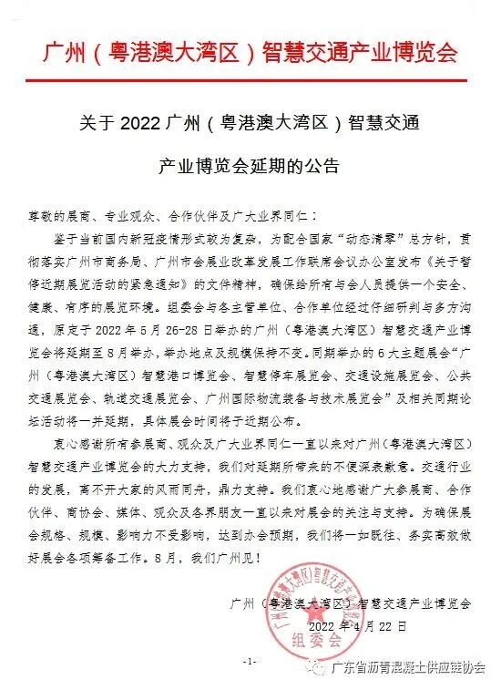 为配合国家“动态清零”总方针,贯彻落实广州市商务局、广州市会展业改革发展工作联席会议办公室发布《关于暂停近期展览活动的紧急通知》的文件精神,确保给所有与会人员提供一个安全、健康、有序的展览环境。组委会与各主管单位、合作单位经过仔细研判与多方沟通,原定于2022年5月26-28日举办的广州(粤港澳大湾区)智慧交通产业博览会将延期至8月举办,举办地点及规模保持不变。同期举办的6大主题展会“广州(粤港澳大湾区)智慧港口博览会、智慧停车展览会、交通设施展览会、公共交通展览会、轨道交通展览会、广州国际物流装备与技术展览会”及相关同期论坛活动将一并延期,具体展会时间将于近期公布。