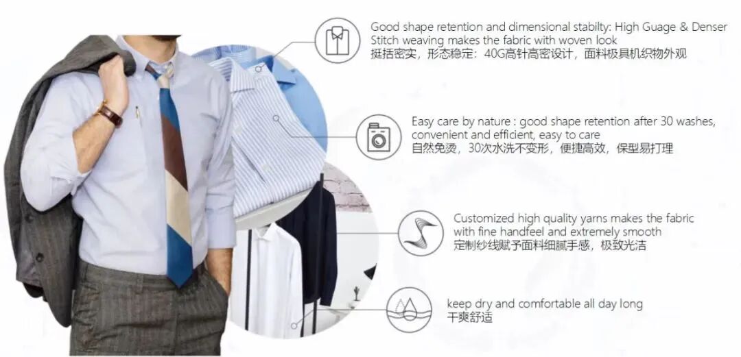 该项目通过对高纱支纱线赛络纺、加捻纺纱技术的研究,实现了针织衬衫的高保形性。具有仿色织衬衫的花型设计实现结构与时尚的立体美。通过仿色织衬衫的花型设计,在保证针织圆机可织的基础上,创新针织花型,开发出了多样化针织衬衫。产品采用色织、提花高机型和高保形工艺填补常规的传统印花,实现产品多花色,从根源上让产品更稳定。纬编针织衬衫加入氨纶,增加衬衫面料弹性,回复性达到90%以上,设计上实现再创新。通过后整理加工,提高衬衫的吸水性、速干性和抗菌性。