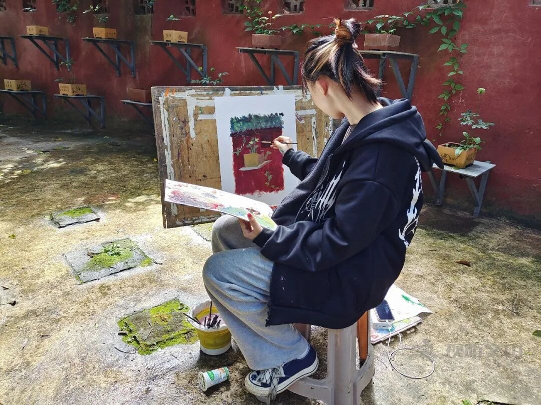 50多名学生在三七艺术展示园内聚精会神地作画,他们要用每一笔每一画来展示文山三七盆景的秀、奇、美。