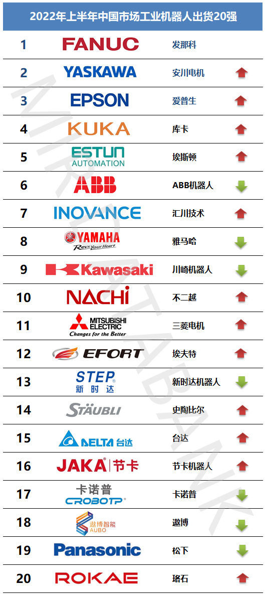 *上下箭头指与2021年中国市场工业机器人出货20强对比排名变化