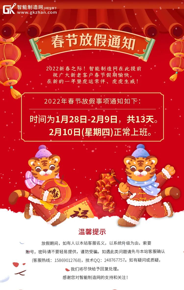 2022农历壬寅虎年即将来临,新年伊始,春节将至,智能制造网提前祝各位新老客户春节假期快乐!虎年迎虎运,好运永相伴!