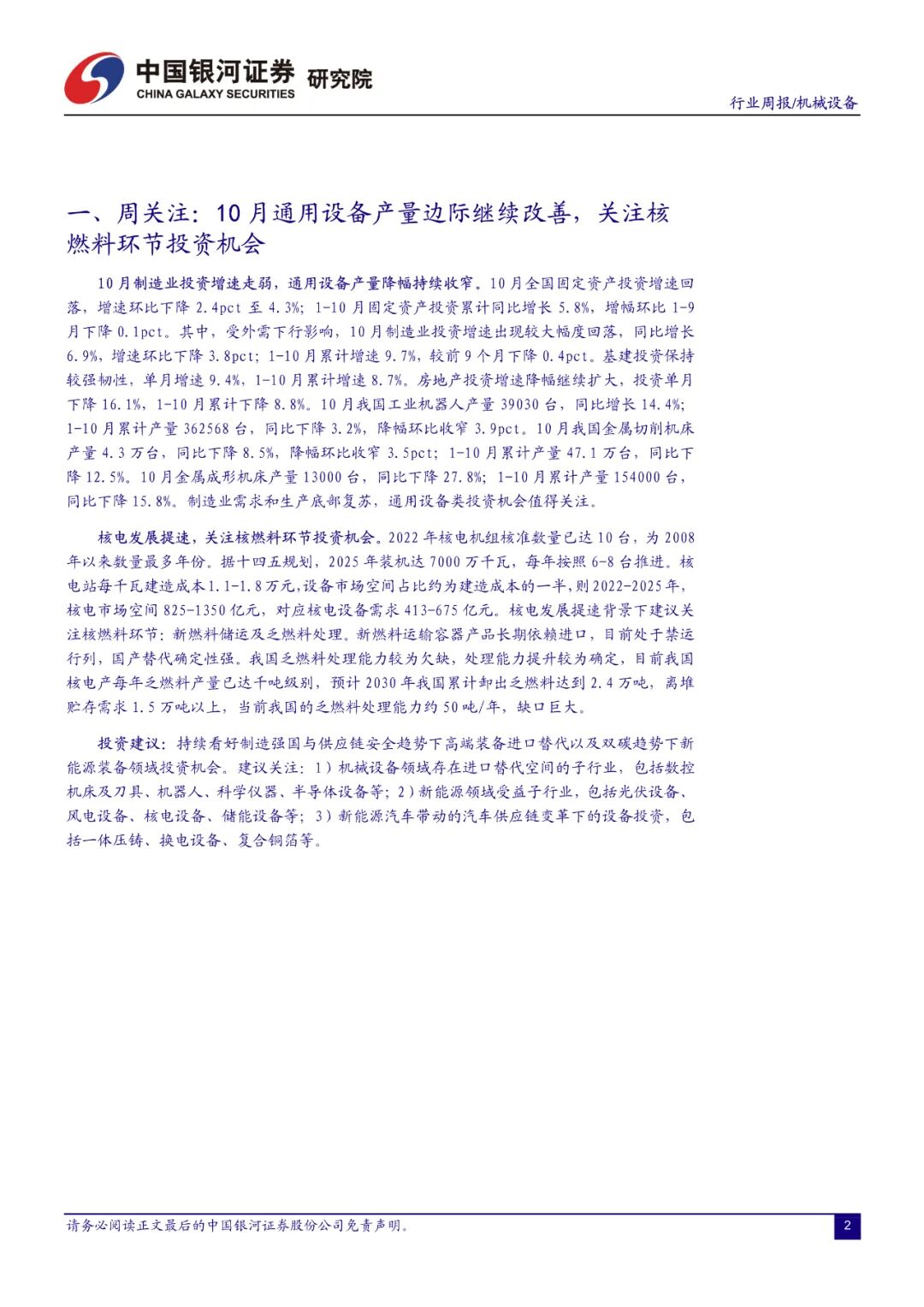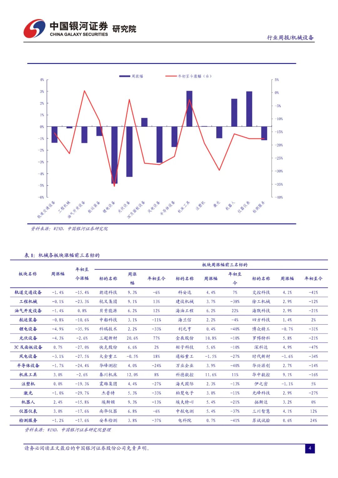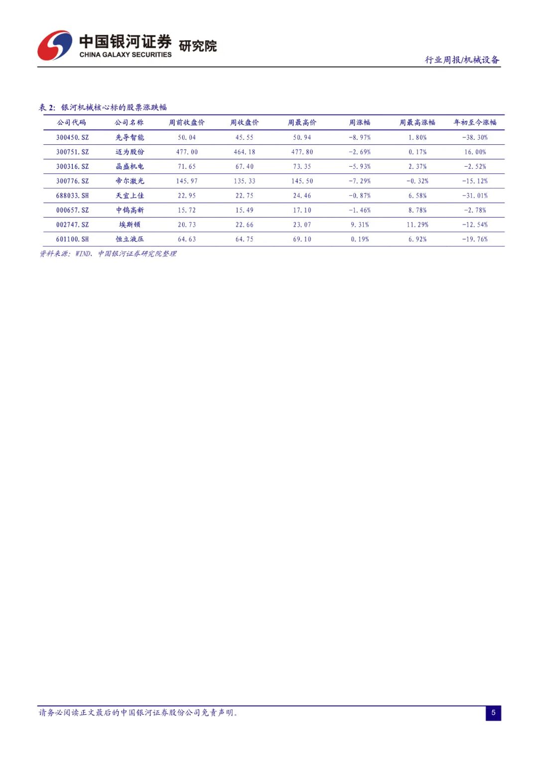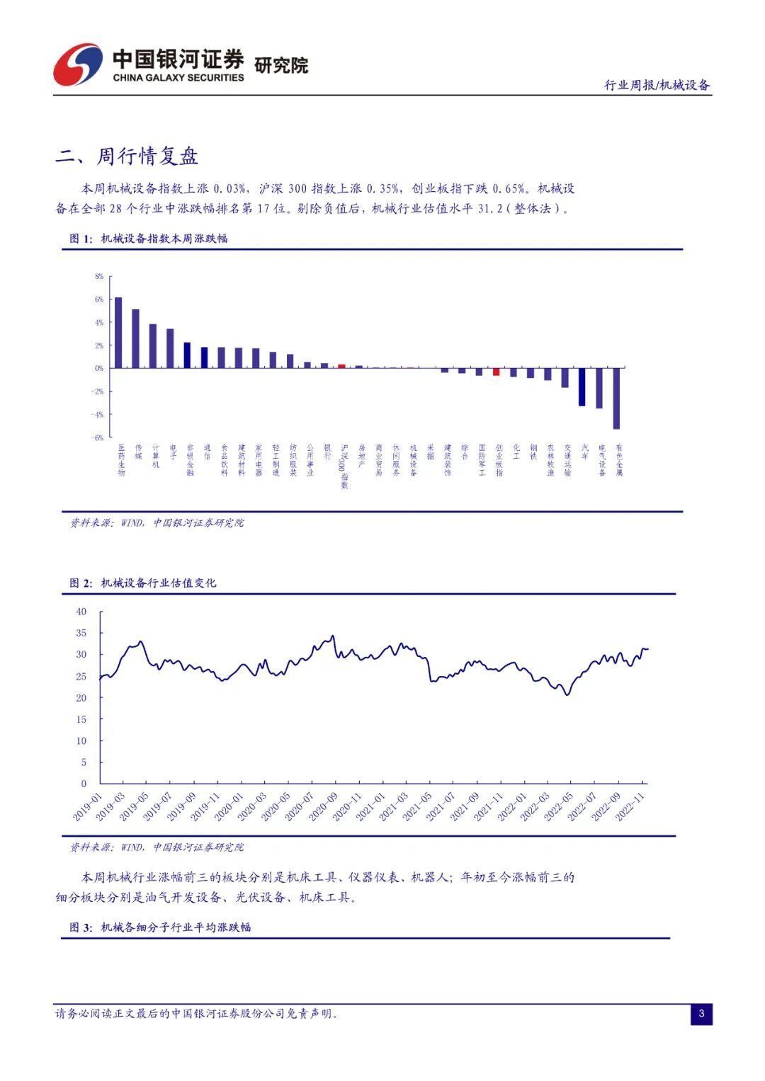 本周机械设备指数上涨 0.03%,沪深 300 指数上涨0.35%,创业板指下跌 0.65%。机械设备在全部 28 个行业中涨跌幅排名第 17 位。剔除负值后,机械行业估值水平 31.2(整体法)。本周机械行业涨幅前三的板块分别是机床工具、仪器仪表、机器人;年初至今涨幅前三的细分板块分别是油气开发设备、光伏设备、机床工具。