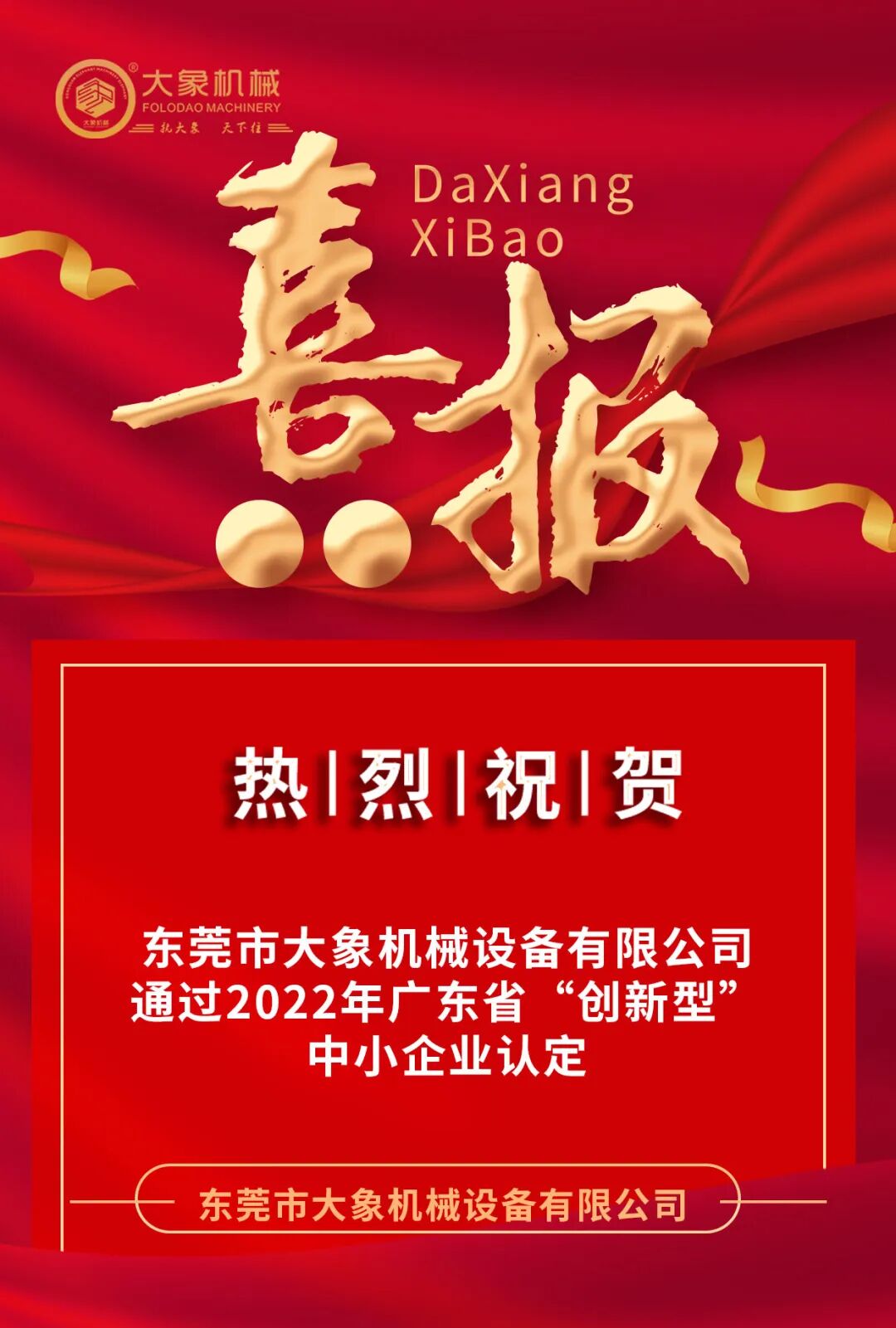 喜报!近日,在广东省工业与信息化厅组织了广东省2022年度创新型中小企业评选通告中,我司凭借在包装机械行业的优异成绩,顺利通过专家组的严格评审,评定为广东省2022年度“创新型”中小企业。特此喜报!