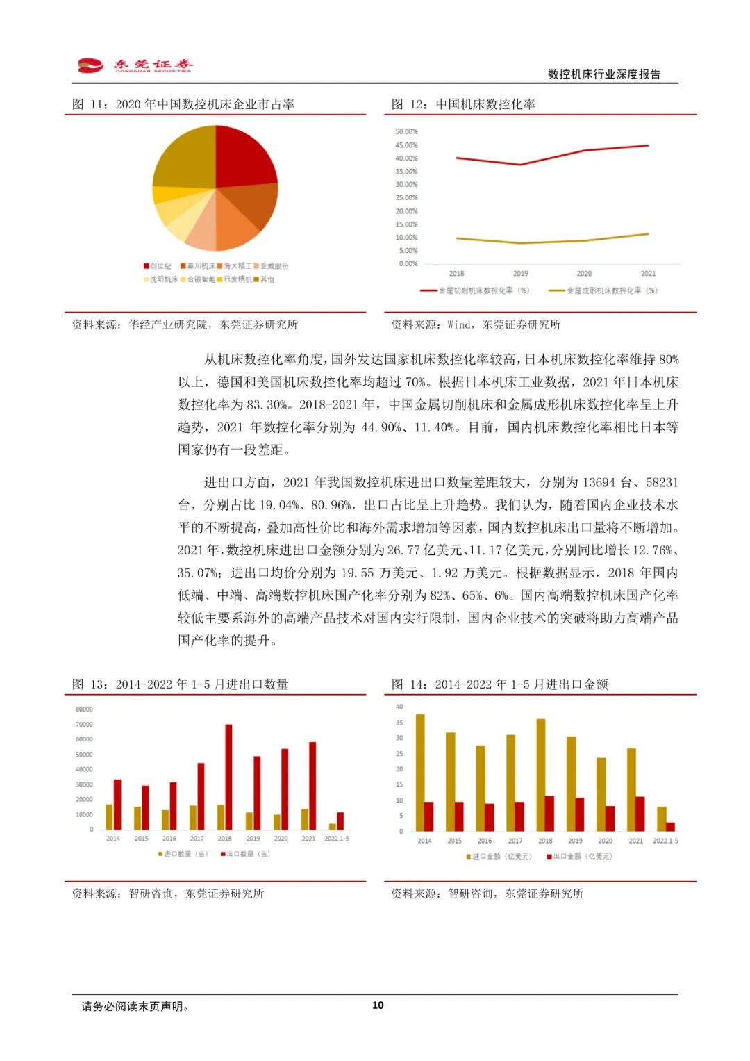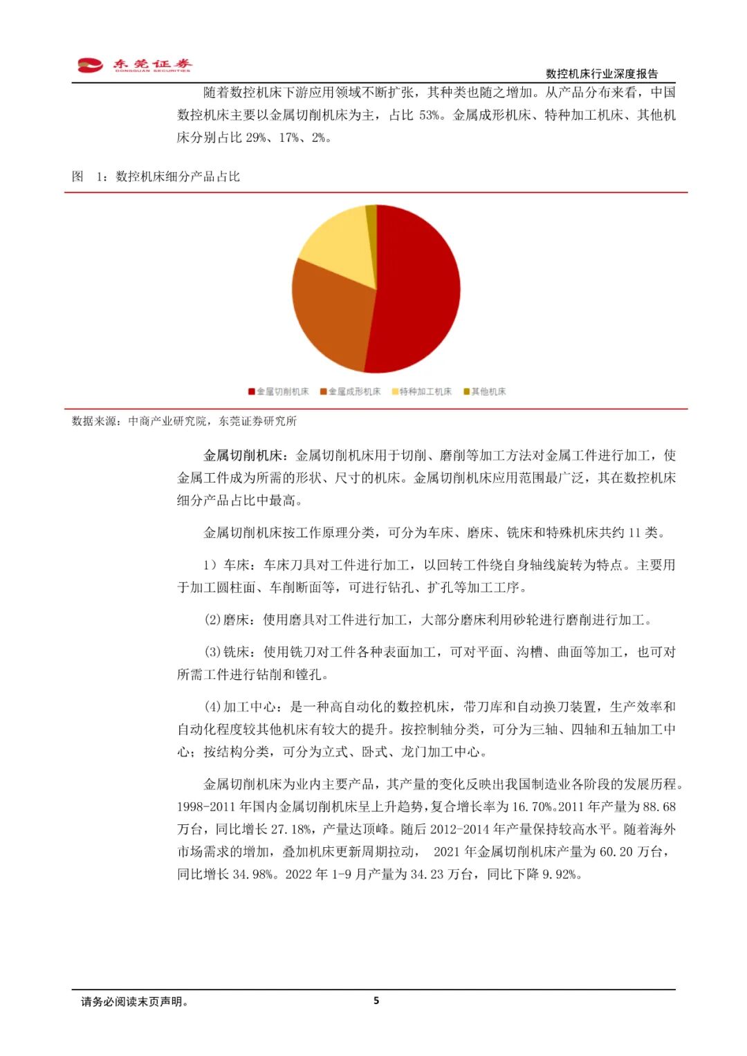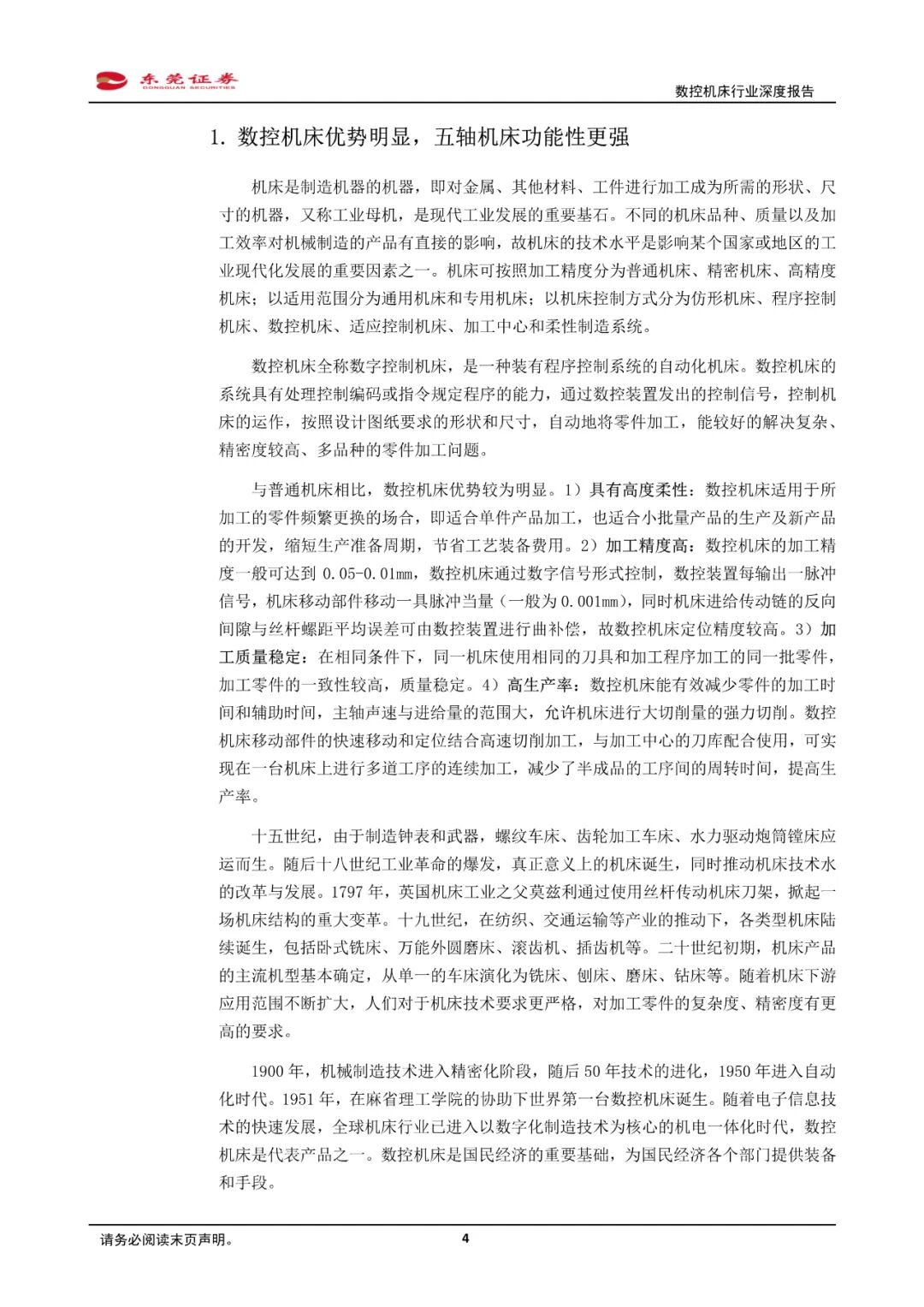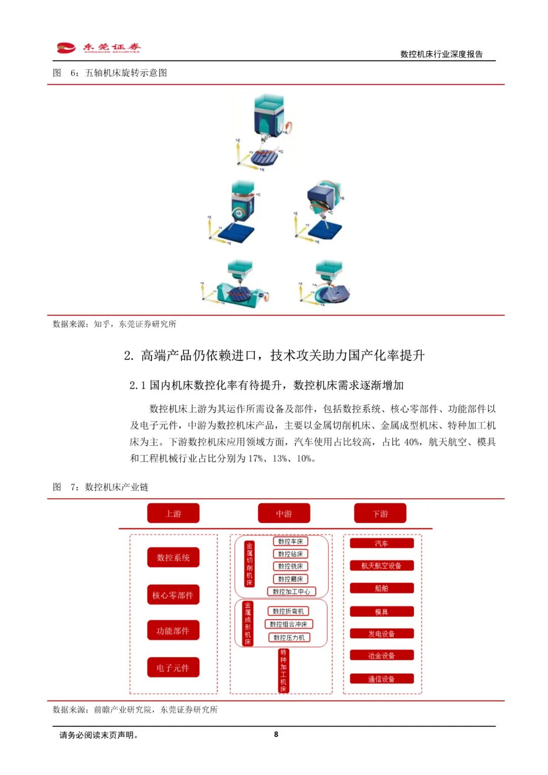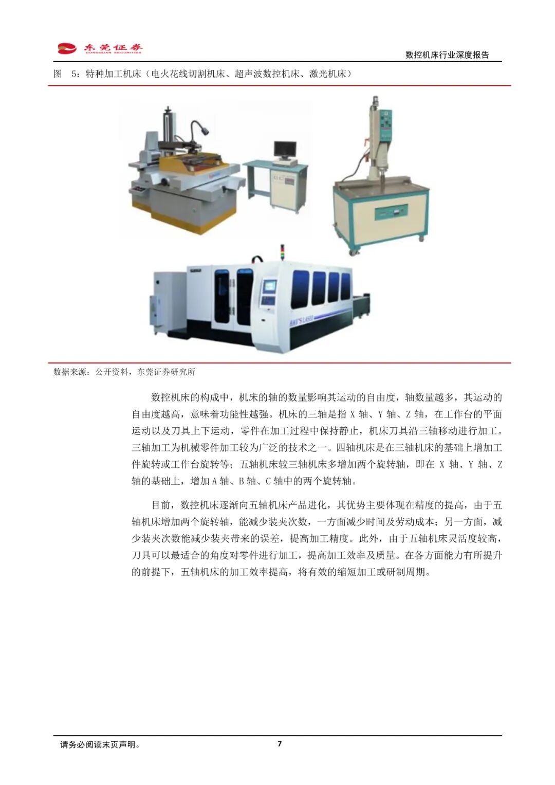 数控机床优势明显,五轴机床功能性更强。机床是制造机器的机器,又称工业母机,是现代工业发展的重要基石。不同的机床品种、质量以及加工效率对机械制造的产品有直接的影响,故机床的技术水平是影响某个国家或地区的工业现代化发展的重要因素之一。与普通机床相比,数控机床具有高度柔性、加工精度高、加工质量稳定以及高生产率等优势。机床的轴的数量影响其运动的自由度,轴数量越多,其运动的自由度越高,意味着功能性越强。目前,数控机床逐渐向五轴进化,其优势主要体现在精度的提高与加工效率的增加。