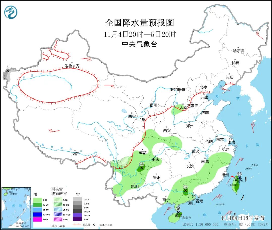 中央气象台预计,4日20时至5日20时,新疆南疆西部山区局地有小到中雪。山西中部、西南地区东部和南部、江南东部和南部、华南中东部等地的部分地区有小到中雨,其中,海南岛东北部、台湾岛东北部局地有大雨或暴雨。
