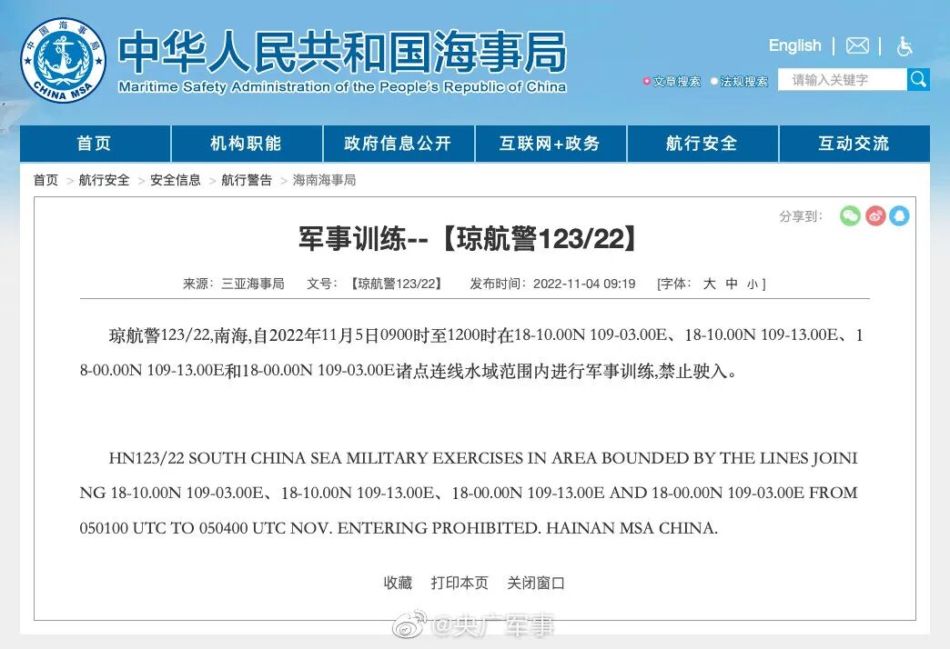 三亚海事局发布航行警告,5日9时至12时,南海部分海域进行军事训练,禁止驶入。