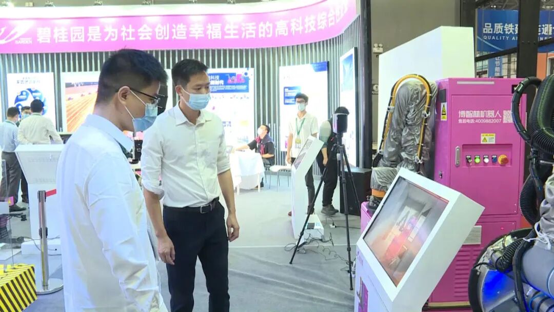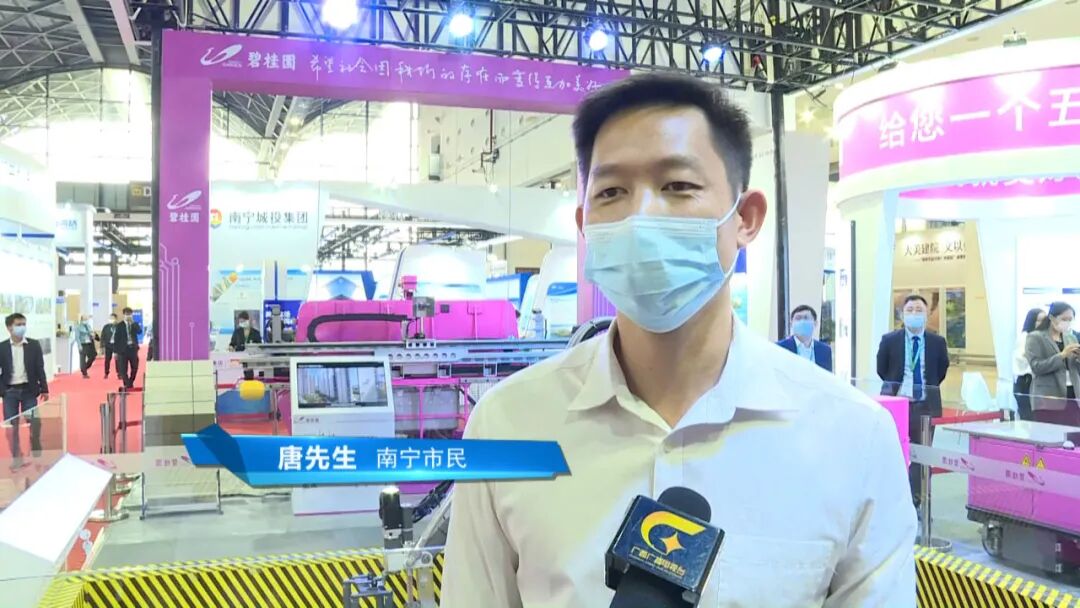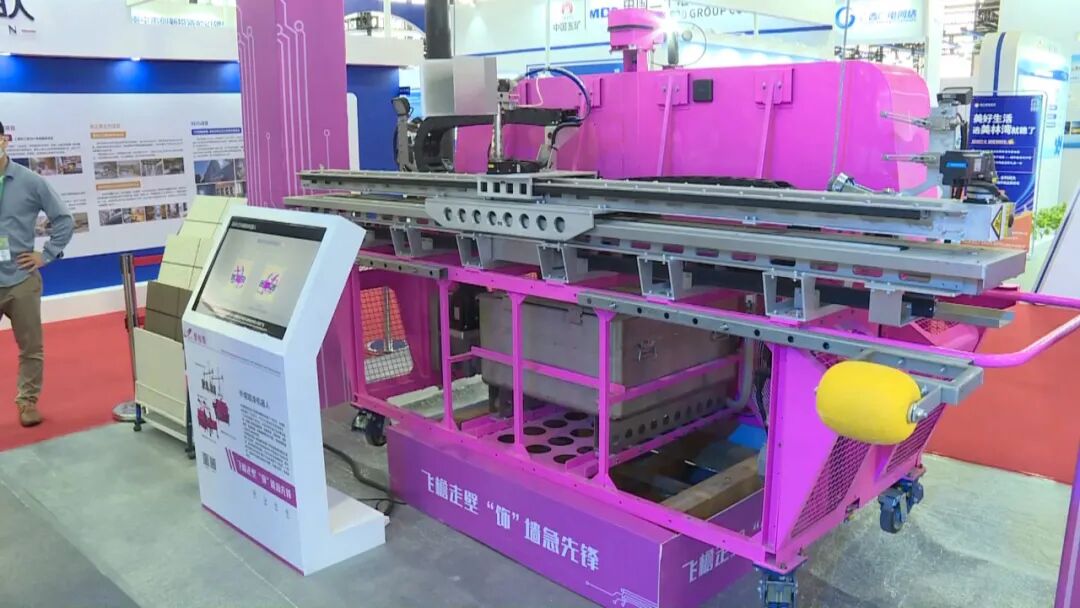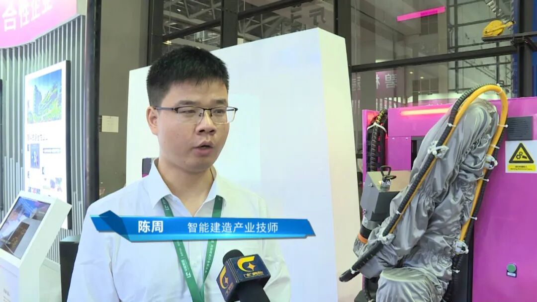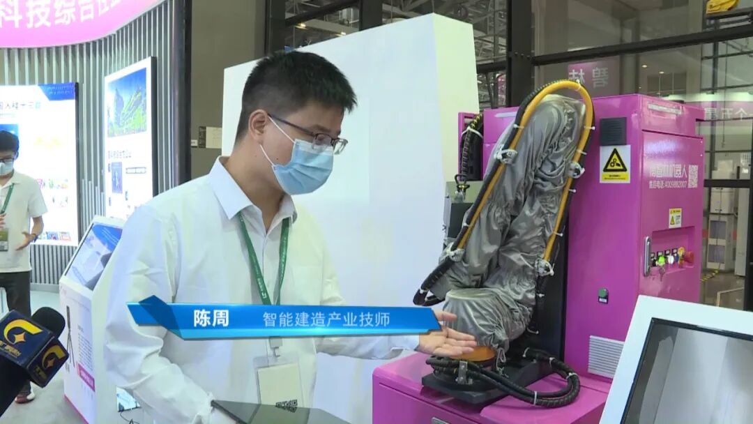 在南宁国际会展中心D区10号展厅,博智林展位的地面整平机器人、腻子涂敷机器人、腻子打磨机器人、地砖铺贴机器人、地坪漆涂敷机器人、外墙喷涂机器人等8款建筑机器人非常吸引眼球。智能建造产业技师陈周向前来参观的市民进行讲解。