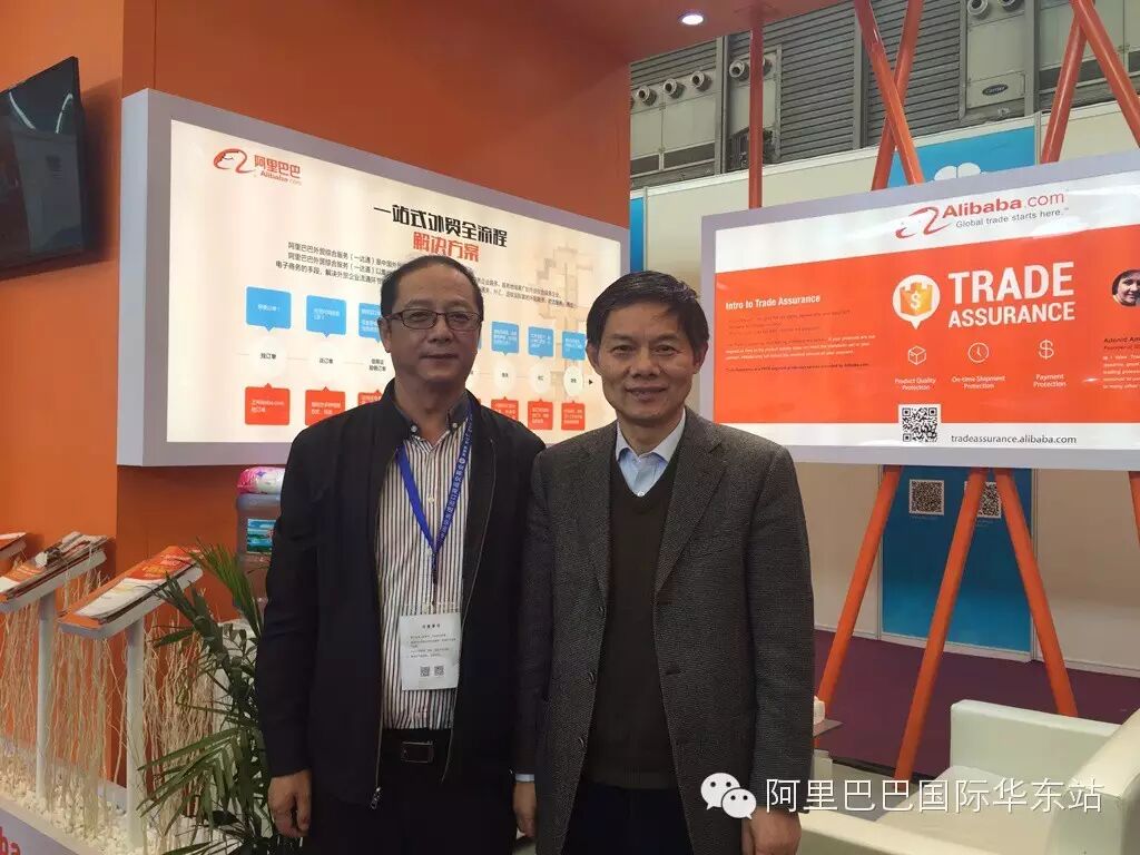 江苏省商务厅副厅长、省贸促会会长笪家祥(右)来展会参观指导,并与阿里巴巴谈出口与合作事项。期间与阿里外贸综合服务事业部经理肖锋(左)合影。