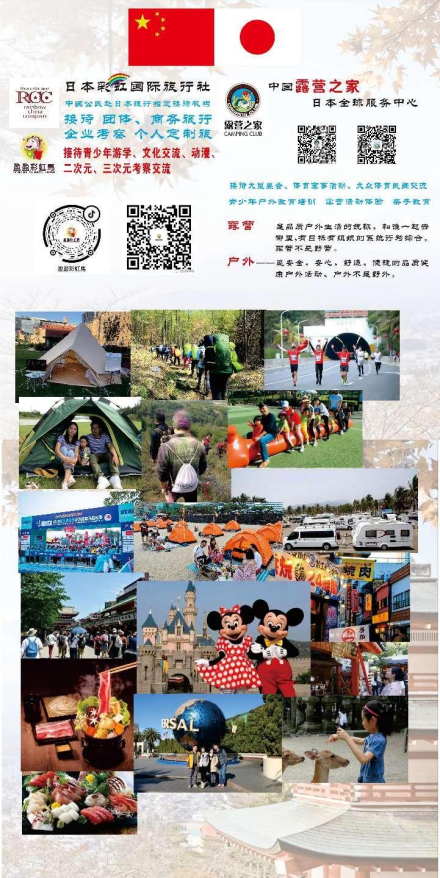 中国露营之家日本全球服务中心服务于中国—日本间商务洽谈、旅游专线、出国留学、文化交流、户外露营体验等各种业务,促进旅游业的蓬勃发展。露营之家按照举办一次大会,落地一个“露营之家”服务中心平台、带动一个产业集群,拉动举办地区经济增长的宗旨,促进我国体育产业和全民健身活动的蓬勃发展,推进地方相关体育、休闲旅游产业链的形成,打造我国体育休闲经济新的增长点,全力打造全球100个城市的1000家一线品牌,为体育大国向体育强国战略提供露营之家TOP计划的智慧和力量!