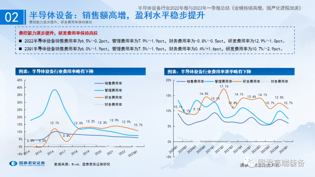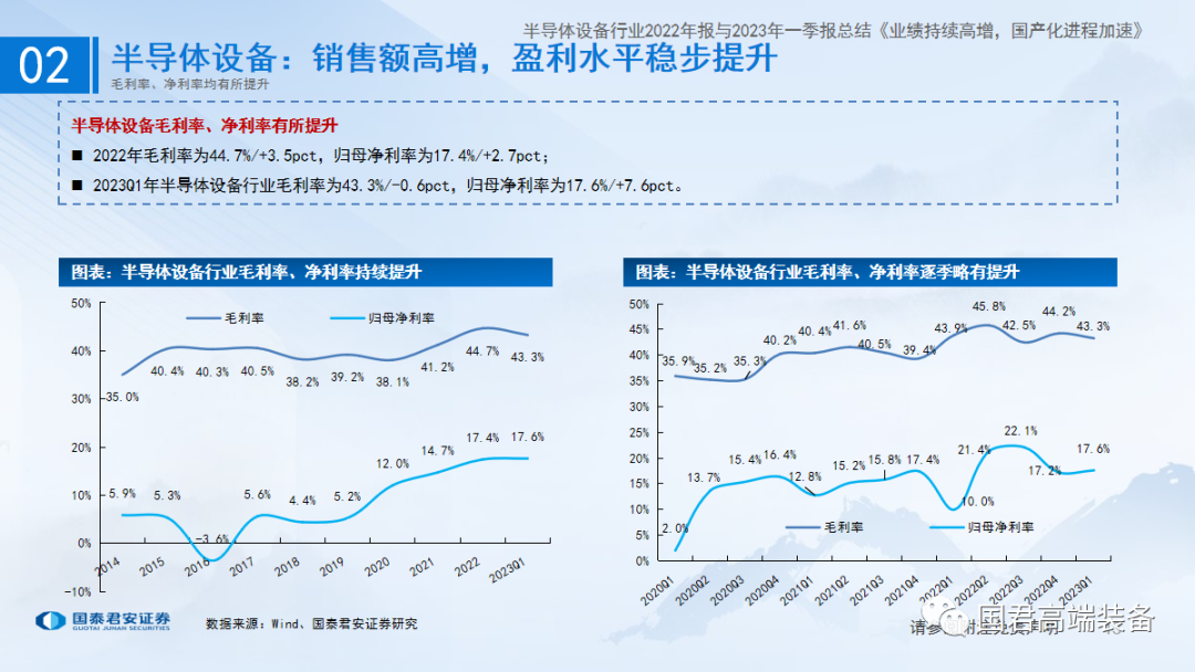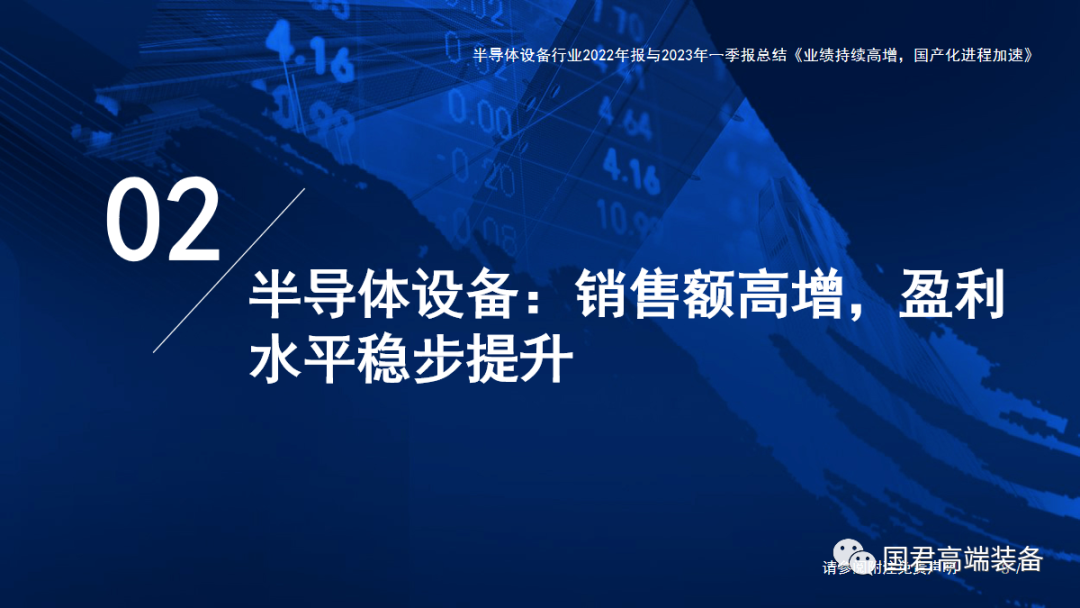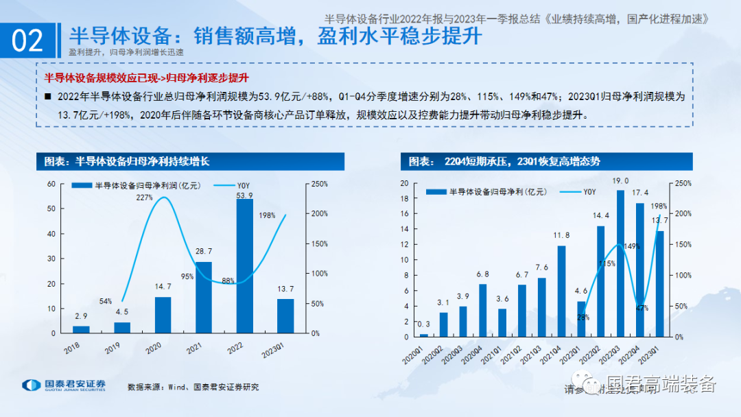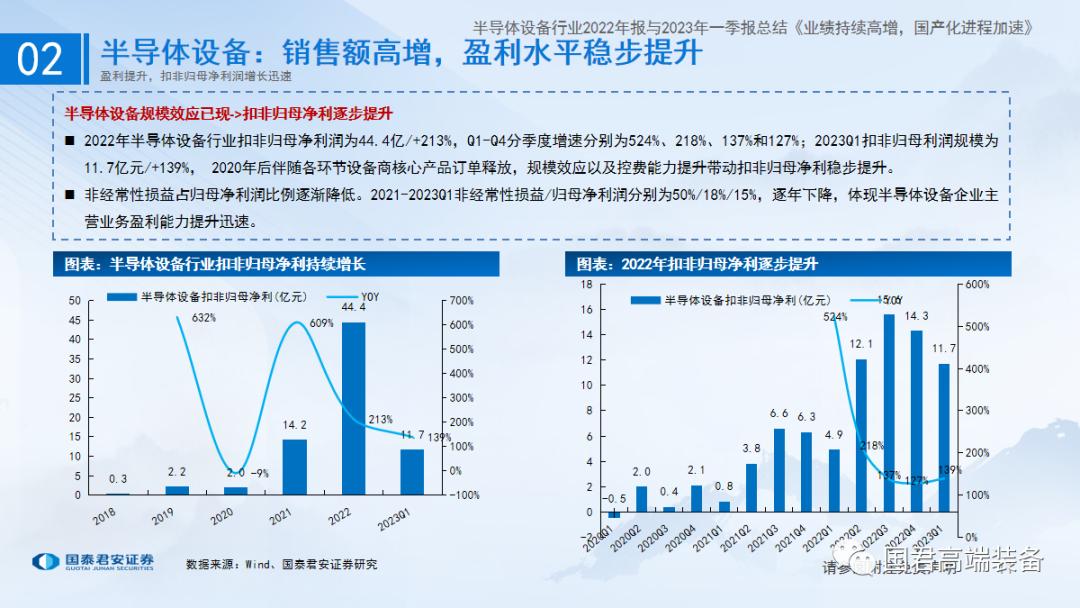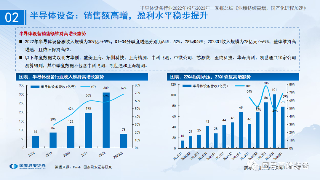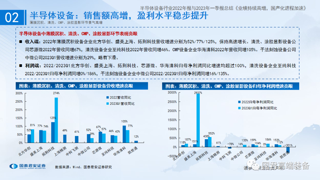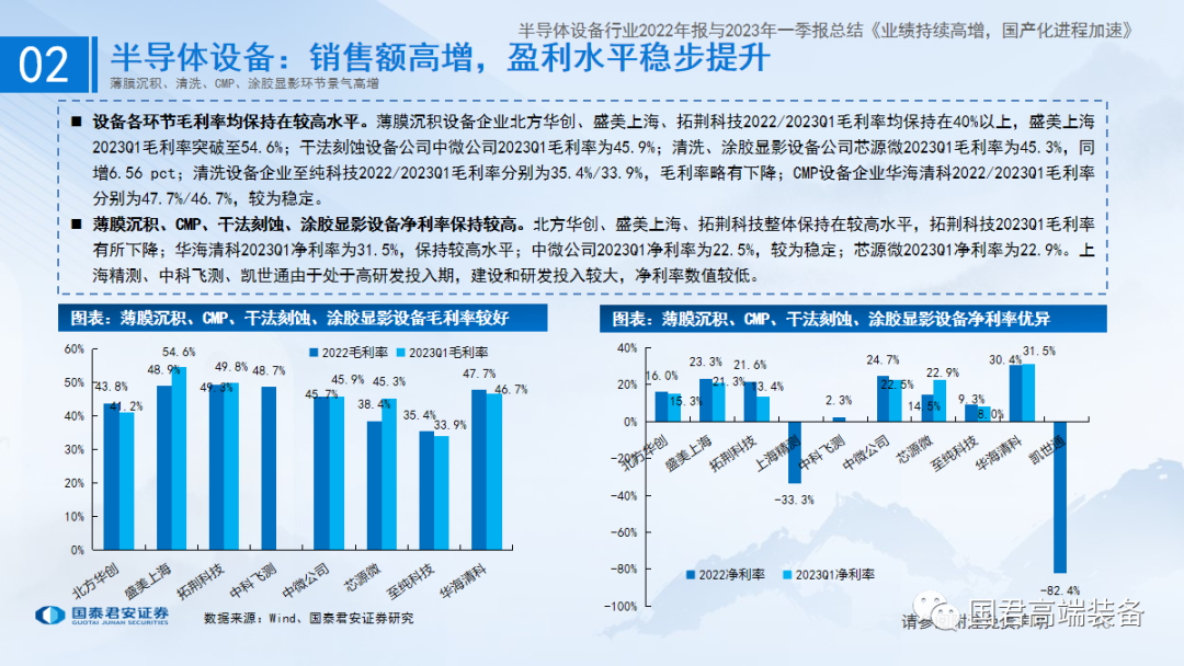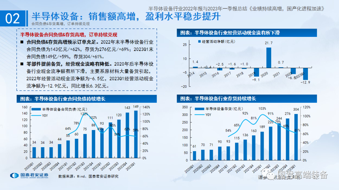 ▶销售额高增,半导体设备盈利水平稳步提升。1)各环节设备商核心产品订单释放,规模效应以及控费能力提升带动扣非归母净利稳步提升。2022年半导体设备总营收309亿/+59%,总归母净利润53.9亿/+88%,总扣非归母净利44.4亿/+213%;毛利率44.7%/+3.5pct,归母净利率17.4%/+2.7pct 。2023Q1总营收78亿/+69%,总归母净利润13.7亿/+198%,总扣非归母净利润44.4亿/+213%;毛利率43.3%/-0.6pct,归母净利率17.6%/+7.6pct。2)合同负债&存货高增,订单持续兑现。2022年末半导体设备总合同负债143亿/+62%,总存货276亿元/+69%;2023Q1末合同负债149亿/+59%,存货304/+61%。