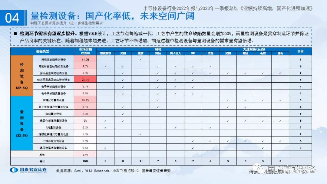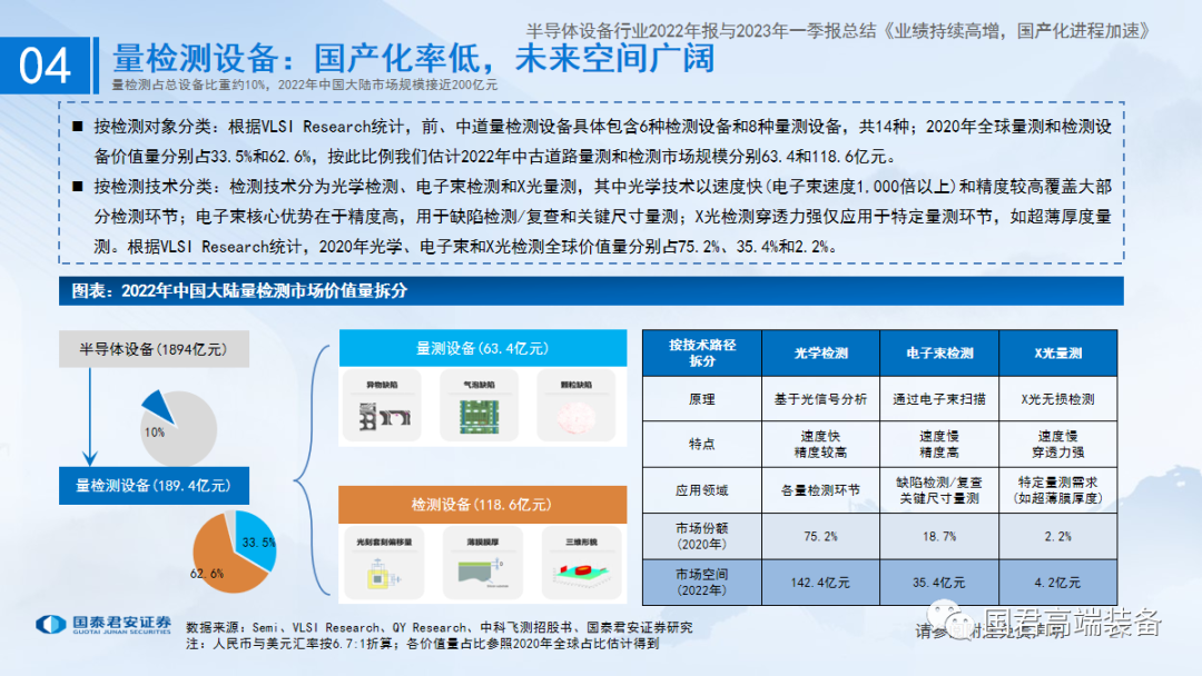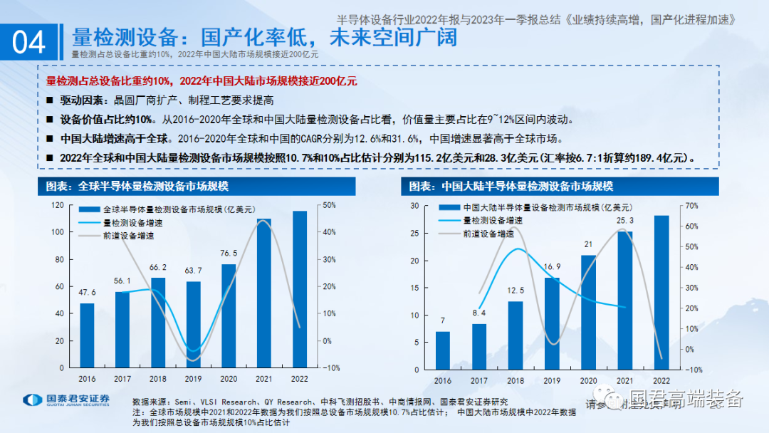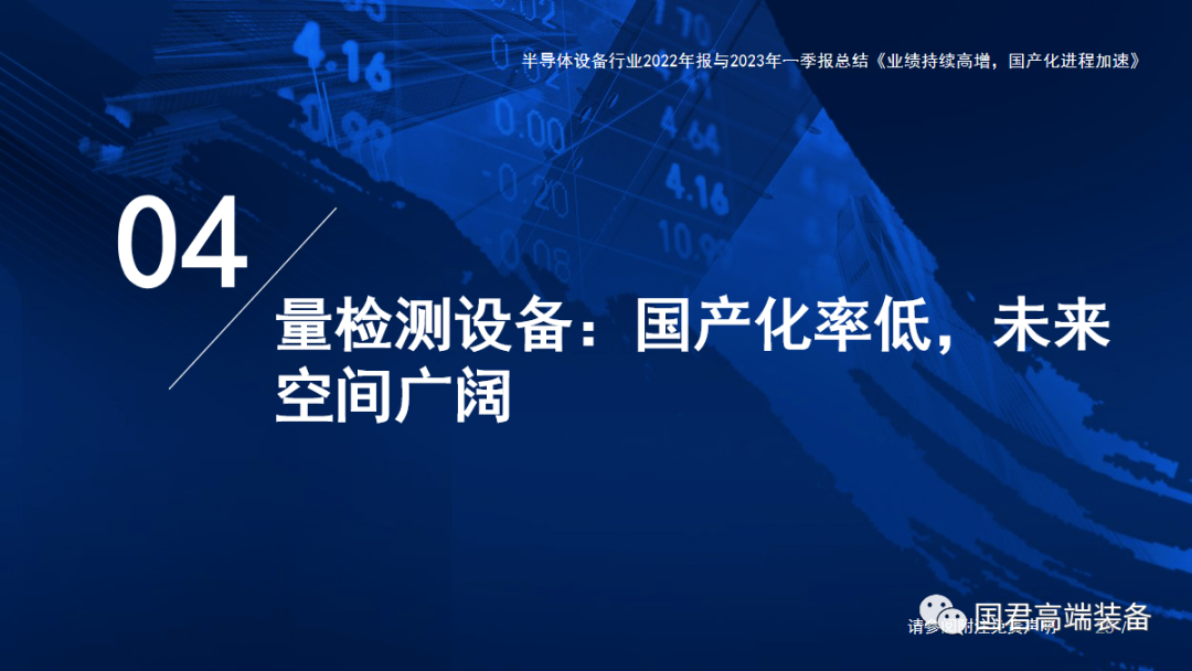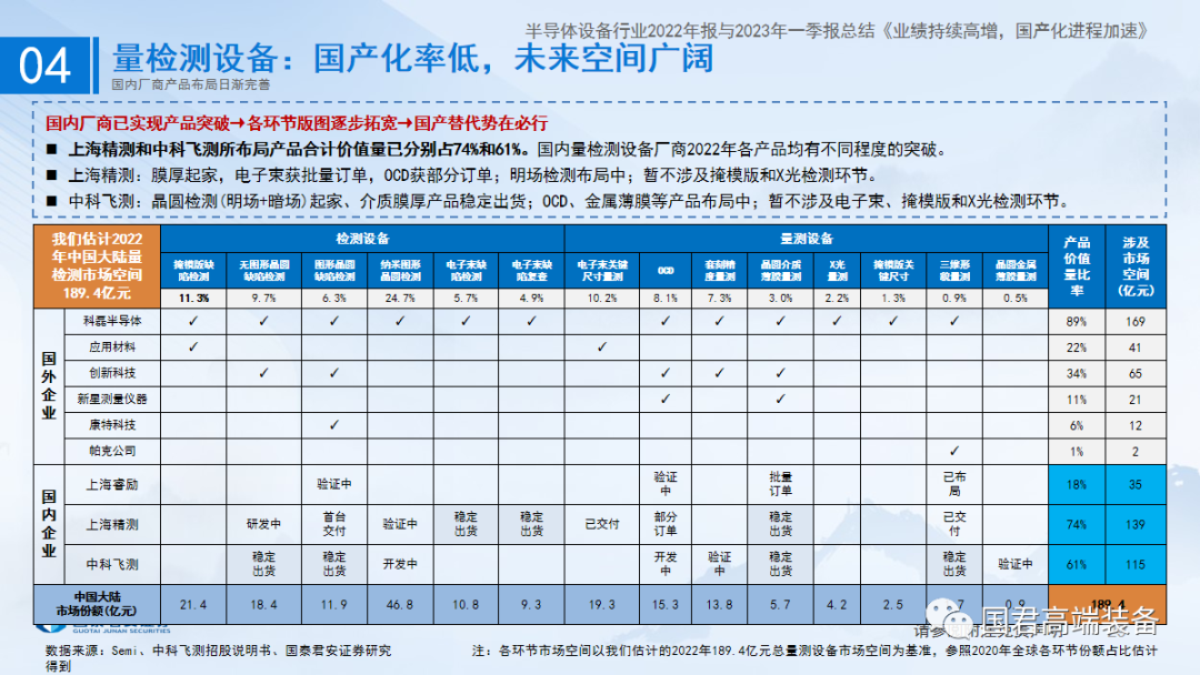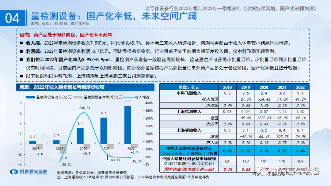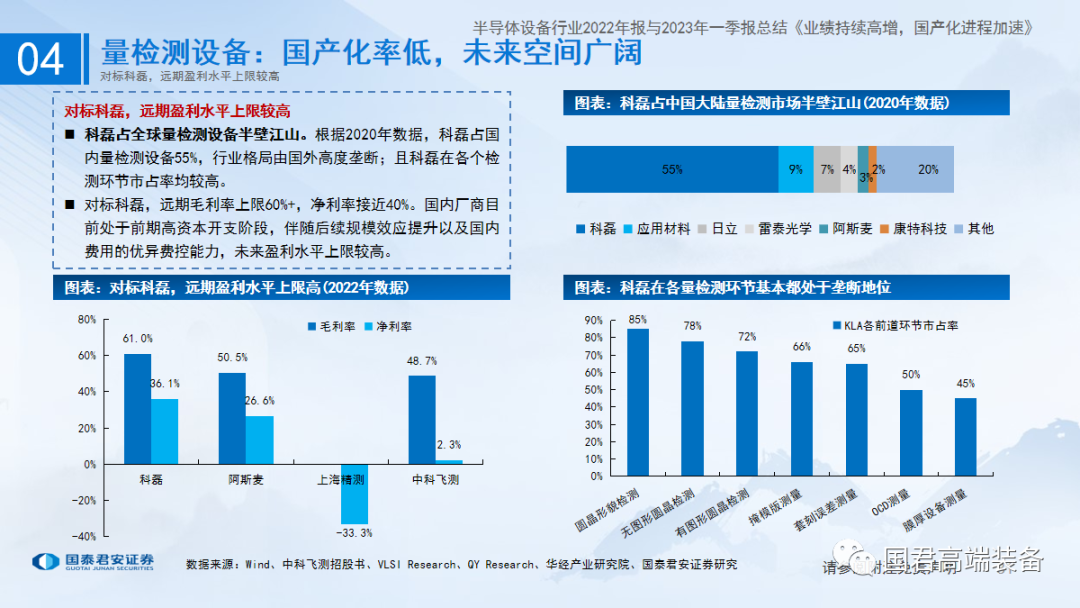 ▶国产化率低,量检测设备未来空间广阔。量检测占总设备比重约10%,我们估计2022年中国大陆市场规模189.4亿元。上海精测(膜厚量测、电子束等)、中科飞测(晶圆检测、形貌量测等)和上海睿励(膜厚产品等)部分产品已实现单点突破,各环节版图布局逐步拓宽,我们估计2022年国产化率为3.9%/+0.9pct。当前量检测设备商仍处于前期高研发投入阶段,叠加规模体量较小仅中科飞测实现盈利;对标科磊,远期盈利水平上限高(毛利率60%+,净利率近40%)。