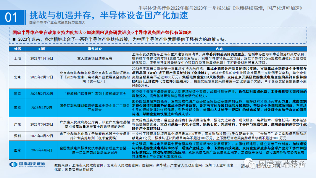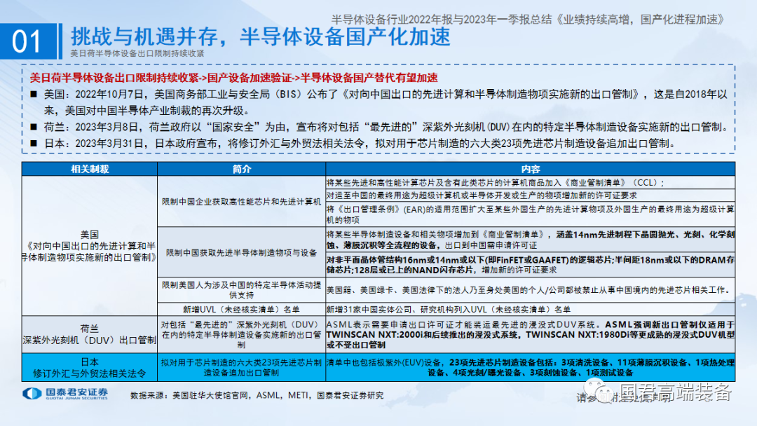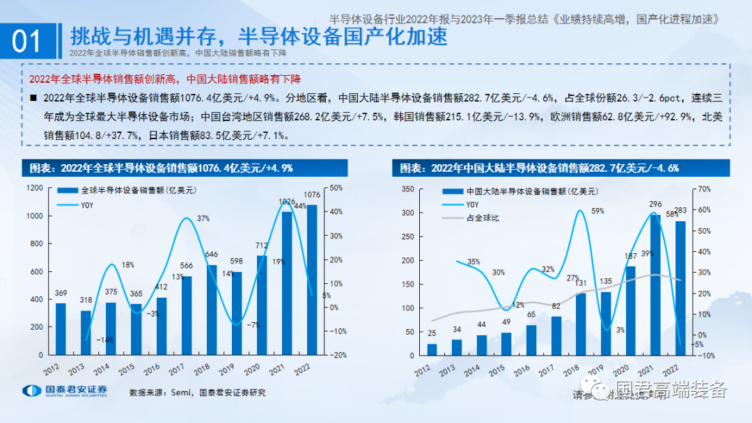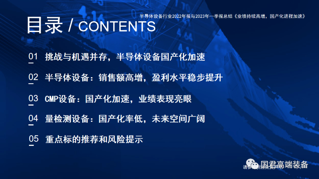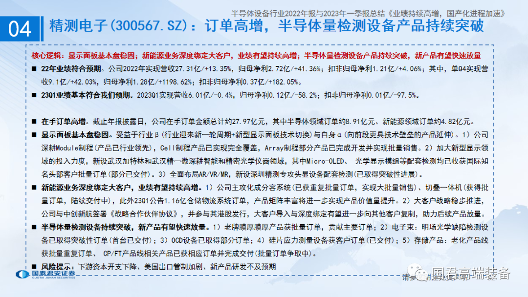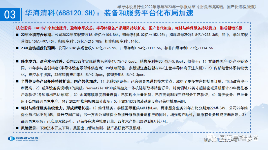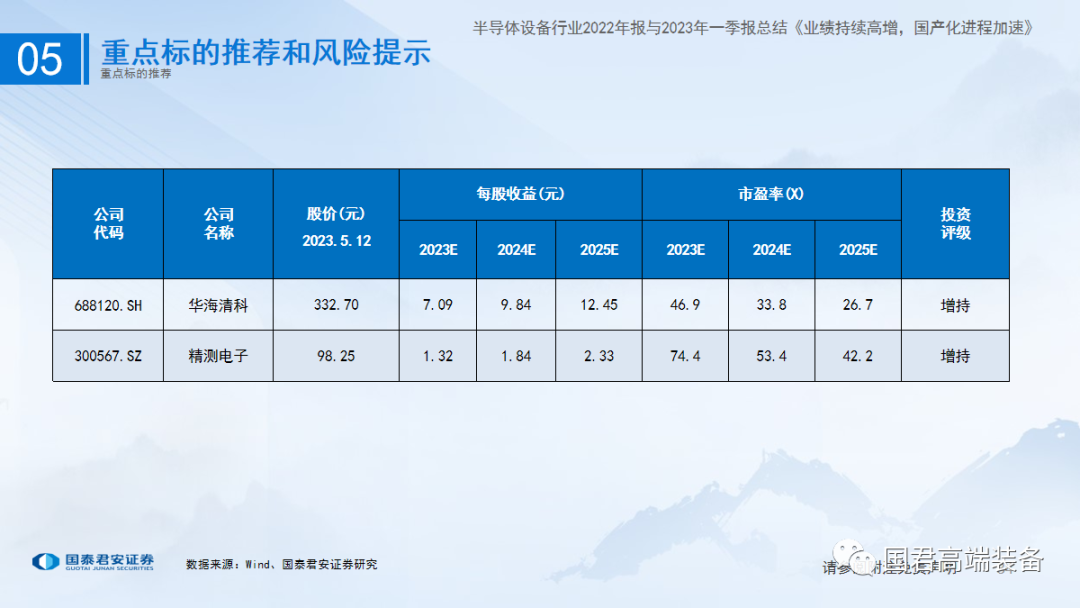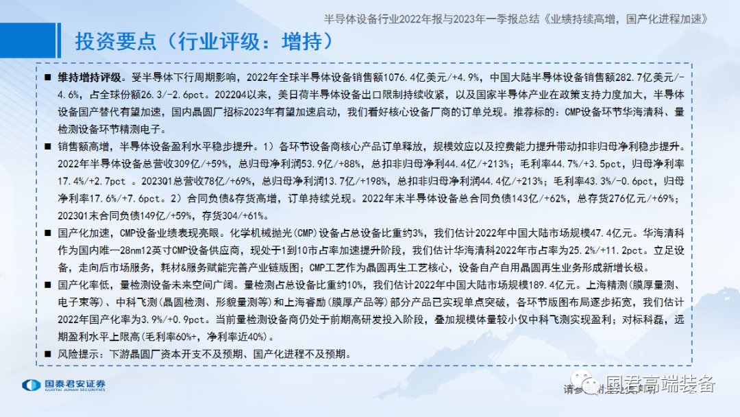 ▶维持增持评级。受半导体下行周期影响,2022年全球半导体设备销售额1076.4亿美元/+4.9%,中国大陆半导体设备销售额282.7亿美元/-4.6%,占全球份额26.3/-2.6pct。2022Q4以来,美日荷半导体设备出口限制持续收紧,以及国家半导体产业在政策支持力度加大,半导体设备国产替代有望加速,国内晶圆厂招标2023年有望加速启动,我们看好核心设备厂商的订单兑现。推荐标的:CMP设备环节华海清科、量检测设备环节精测电子。