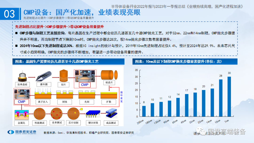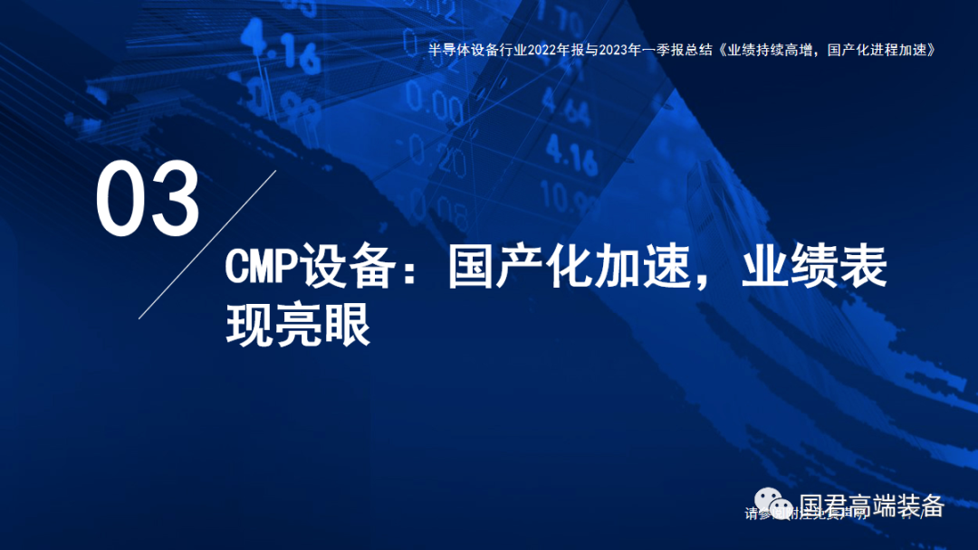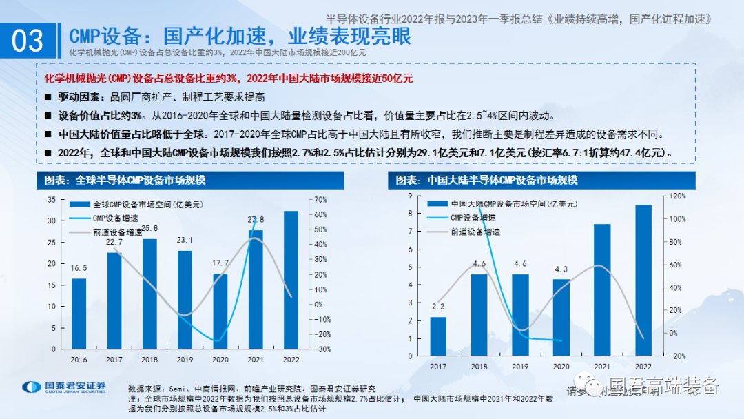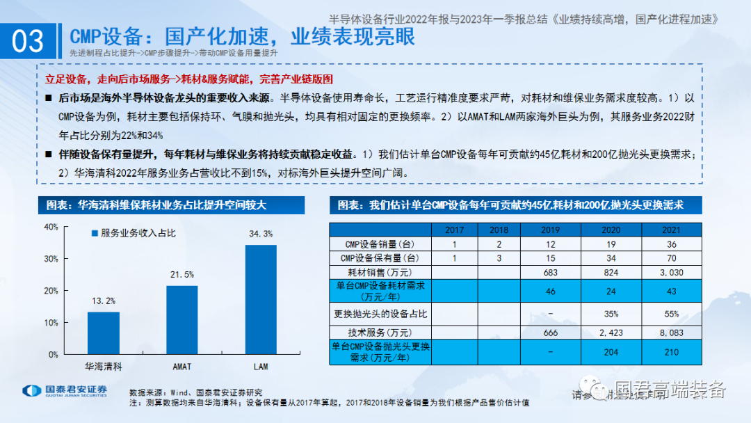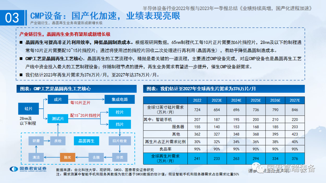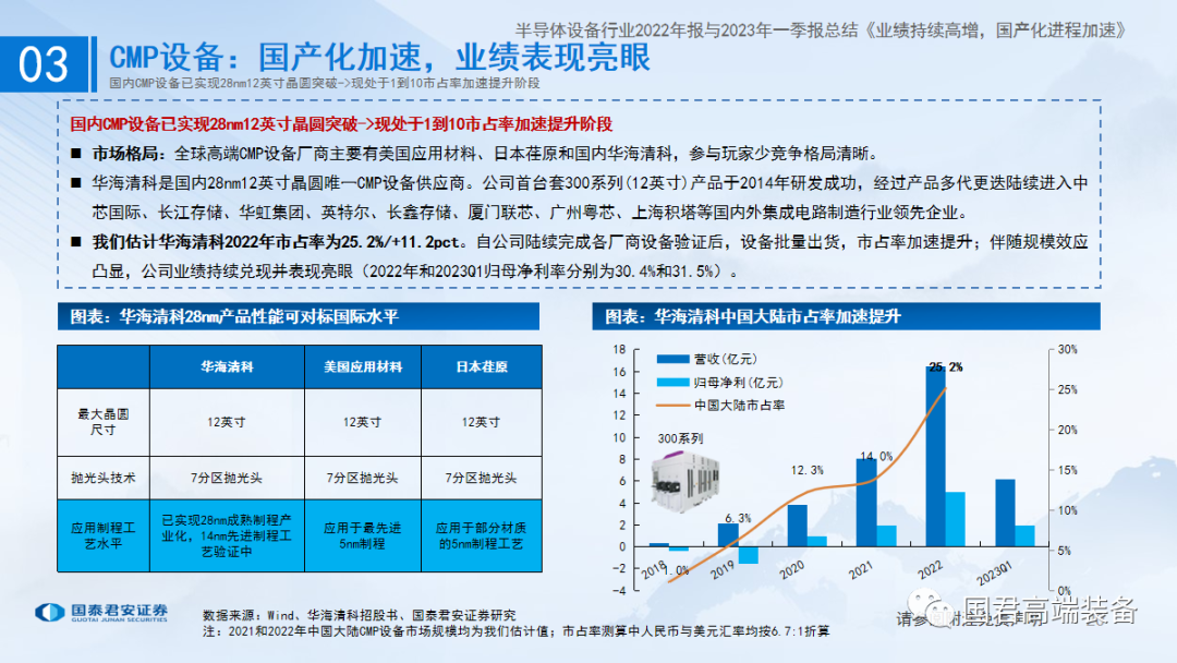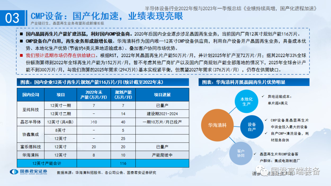 ▶国产化加速,CMP设备业绩表现亮眼。化学机械抛光(CMP)设备占总设备比重约3%,我们估计2022年中国大陆市场规模47.4亿元。华海清科作为国内唯一28nm12英寸CMP设备供应商,现处于1到10市占率加速提升阶段,我们估计华海清科2022年市占率为25.2%/+11.2pct。立足设备,走向后市场服务,耗材&服务赋能完善产业链版图;CMP工艺作为晶圆再生工艺核心,设备自产自用晶圆再生业务形成新增长极。