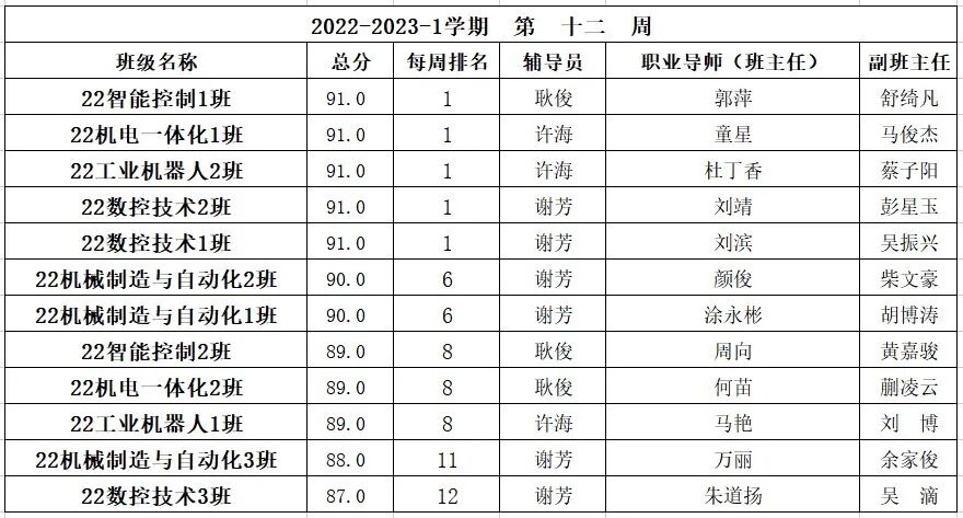 【智能制造学院2022-2023-1学期第十二周班级量化考核】