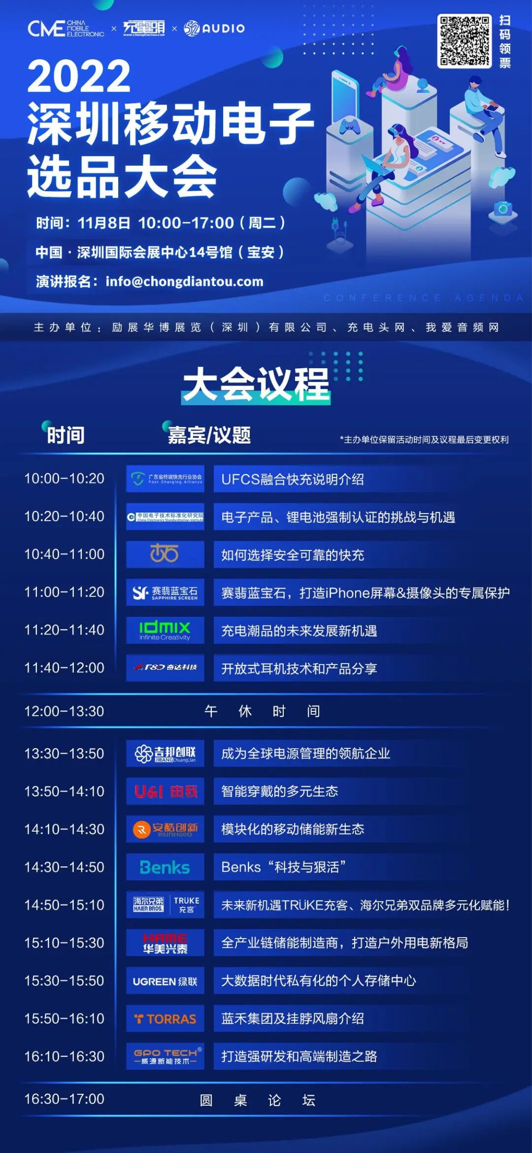 1、专注于消费电子、3C数码等垂直领域的B2B专业展览会,站式采购全品类电子产品;2、传统与新型买家的结合、国内与国际贸易的“双循环”;3、主办方拥有百万级买家库,辐射大量电子行业优质买家群体;4、线上线下展会渠道强强联合,全方位多角度的宣传推广;5、充电头网,我爱音频网,与CME三大平台强强联手,进一步实现资源整合,为更多厂商提供面对面学习交流的桥梁。移动音频、移动快充成为全球市场新的增长走向,在消费电子市场的关键转型期,CME联合多个行业专业协会、媒体, 经过深入市场调研与动向预测,将展品进一步细分, 作针对性推广,精准邀约买家,将展会进一步塑造成全球瞩目的专业盛会。本次深圳国际移动电子展选品大会汇集了数家优质企业,华为、小米、中兴、邦克仕、小度、罗技、SKG、红魔等众多龙头品牌和行业新锐前来参展。本次「2022深圳国际移动电子展选品大会」我们邀请15位重量级嘉宾给我们带来分享他们分别是: