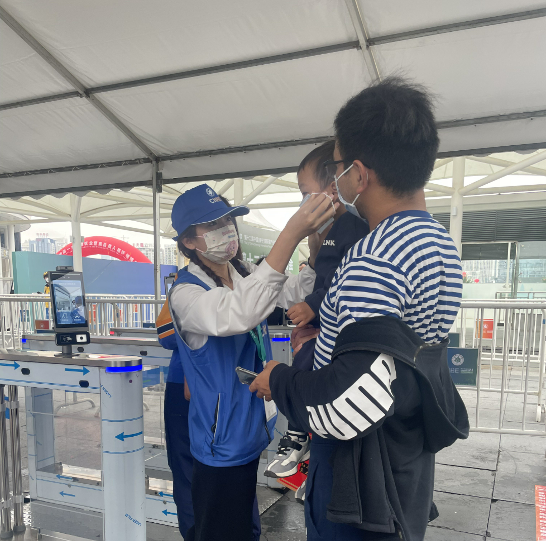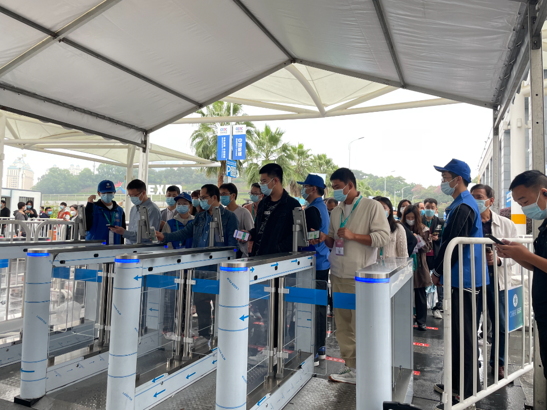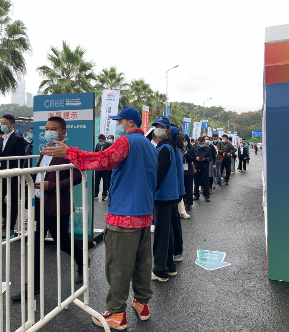 志愿者们守好建博会入场第一道关卡,负责会展各个闸机口的人工辅助核验健康码,核酸,体温。维护排队过闸机的秩序,以及帮助进入会展的人员解决如何快速通过闸机口。