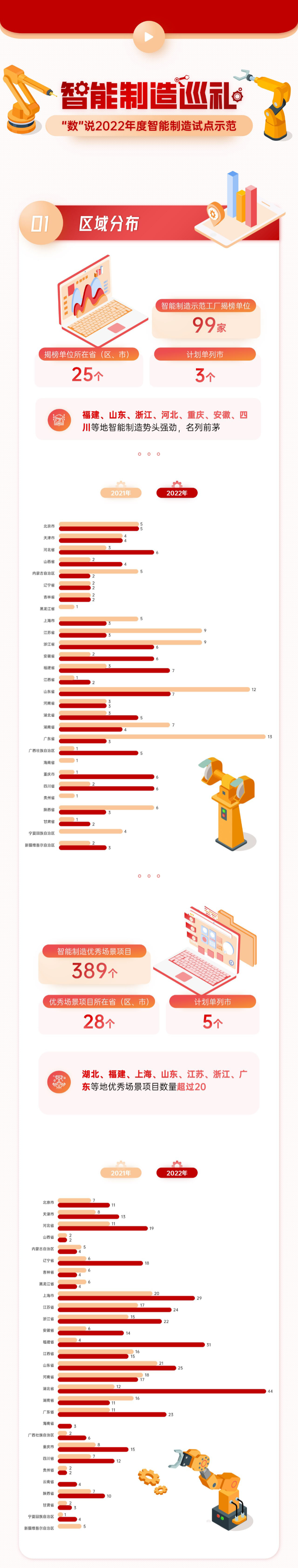 本期“智能制造巡礼”专题从区域分布、行业分布、企业分布、场景分布四个角度,围绕《2022年度智能制造示范工厂揭榜单位和优秀场景名单》进行“数”说解读。