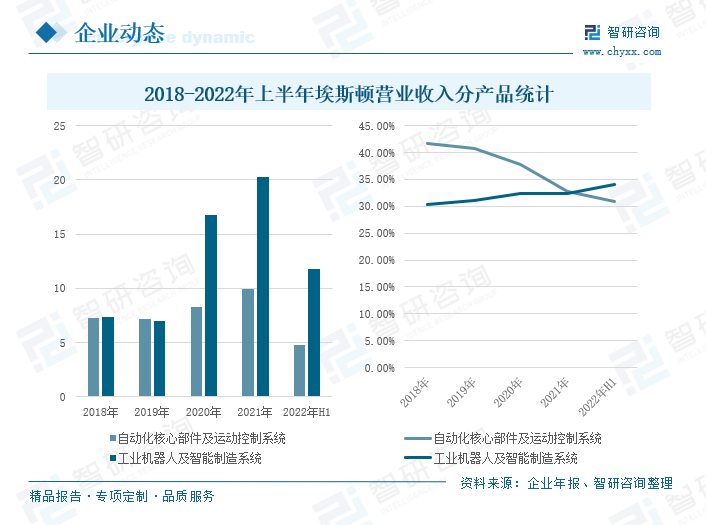 埃斯顿成立于1993年,2015年3月在深交所挂牌上市,是国产智能工业机器人“四小龙”之一。公司的业务覆盖了从自动化核心部件及运动控制系统、工业机器人到机器人集成应用的智能制造系统的全产业链,其业务布局涵盖海内外市场,在焊接机器人和康复机器人等方面处于国际领先的竞争地位。截至2022年上半年,公司共拥有57种型号工业机器人产品,包括六轴通用机器人、四轴码垛机器人、SCARA机器人以及行业专用定制机器人,工作负载从区间为3kg-600kg。企业年报显示,2018-2022年上半年,公司自动化核心部件及运动控制系统营业收入保持基本稳定,工业机器人及智能制造系统上涨趋势明显,2022年上半年,公司自动化核心部件及运动控制系统营业收入为4.76亿元,同比下降0.17%;工业机器人及智能制造系统为11.8亿元,同比增长8.71%。虽然受新冠疫情、国际物流不畅、大宗商品原材料价格上涨、芯片短缺等因素的影响,工业机器人业务的发展带来一定的影响,但由于新能源汽车动力电池、光伏等新能源行业市场十分火热,推动了公司工业机器人及智能制造产品营业收入增长。2022年上半年,自动化核心部件及运动控制系统毛利率为30.88%,同比上升0.62个百分点;工业机器人及智能制造系统为34.05%,同比下降0.46个百分点。埃斯顿通过进一步优化产业链结构、提高核心零部件的国产化替代以及实施精细化管理等方式进行降本增效,推动工业机器人及智能制造的毛利率稳步上升。