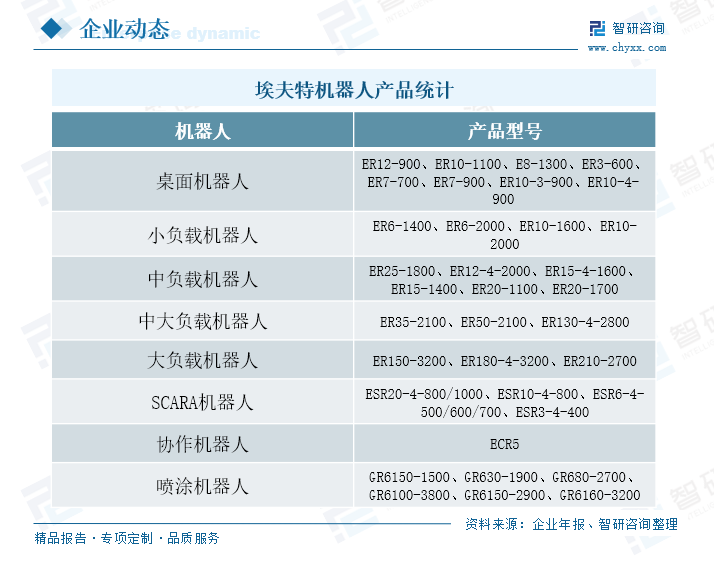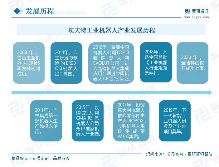 埃夫特是是国家机器人产业区域集聚发展试点重点单位,处于我国工业机器人行业第一梯队的企业,公司主要为客户提供工业机器人以及智能和制造解决方案。埃夫特公司成立于2007年8月,公司成立后与哈尔滨工业大学机器人研究所签订了机器人项目合作协议,正式进入机器人研究领域;2008年,公司首台工业机器人ER165研发并试制成功;2015-2017年期间,公司相继收购了意大利CMA喷涂机器人公司、EVOLUT公司、机器人核心零部件生产商ROBOX和机器人系统集成商W.F.C集团;2020年,成功在上交所的科创板上市。通过引进、融合国际上的先进技术和经验,公司已经形成从机器人核心零部件到机器人整机再到机器人高端系统集成领域的全产业链协同发展格局,是少数国产机器人企业同时布局核心零部件、整机制造、系统集成的厂商。目前,公司正积极布局智能工业机器人及系统等前沿性工业机器人与智能制造升级技术。