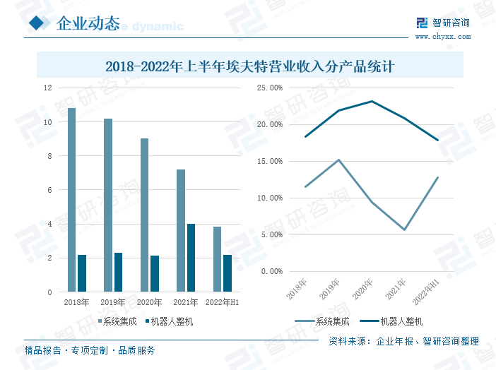 从公司的营业收入来看,2018-2022年上半年,公司系统集成产品的营业收入连年下降,机器人整机产品的营业收入整体呈上升趋势,2022年上半年,公司系统集成产品的营业收入为3.82亿元,同比增长10.40%;机器人整机产品的营业收入为2.17亿元,与去年同期持平。2022年上半年,公司继续聚焦工业机器人业务,推动系统集成业务与整机业务协同发展,不断拓宽业务范围,为富士康、比亚迪等客户提供工业机器人产品,紧抓新能源发展风口,与新能源行业的多家龙头企业达成合作,推出新型机器人产品为公司经营业绩的增长提供助力。