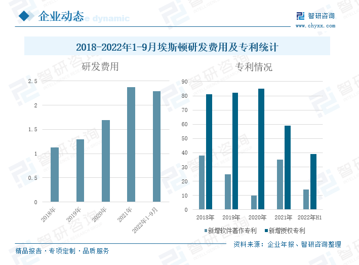 据企业年报,2018-2022年1-9月,公司的研发费用逐年增长,2022年1-9月,公司的研发费用为2.29亿元,同比增长21.80%。公司十分重视技术研发,通过积极引进国内外的科研人才,组建机器人及智能制造系统的研发团队,与知名大学建立研发合作,不断提高公司的自主研发和技术创新能力。受益于公司研发费用的增加,企业专利数量持续增长,截至2022年上半年,公司新增软件著作专利14件,新增授权专利39件,累计软件著作专利246件,累计授权专利528件。