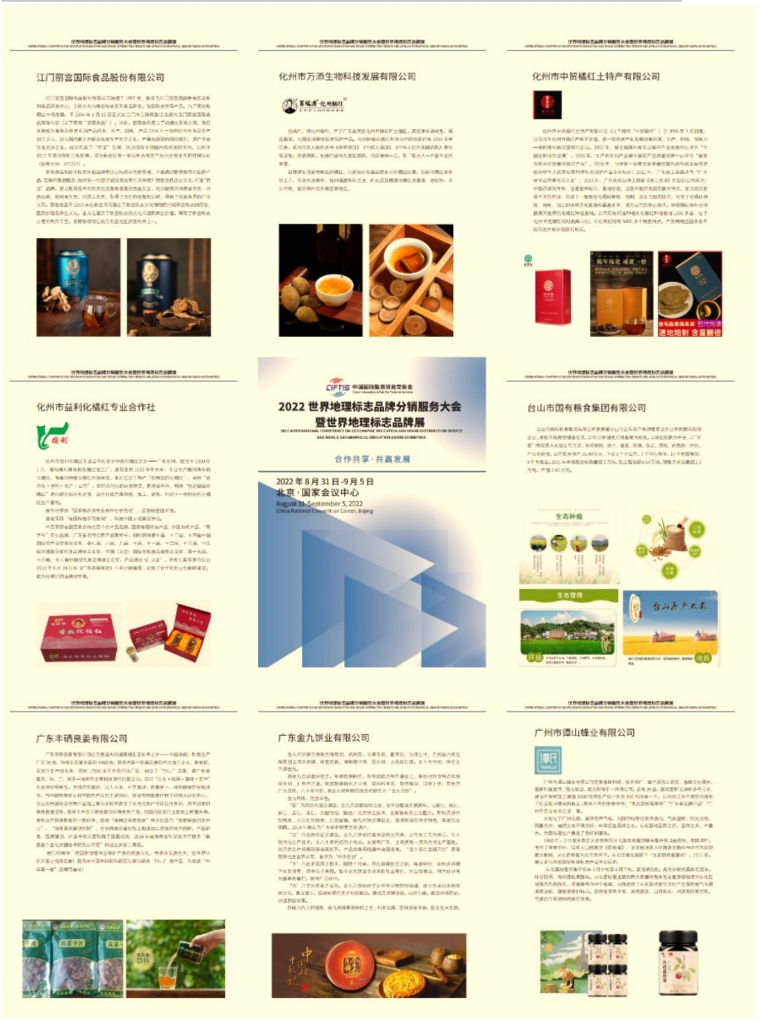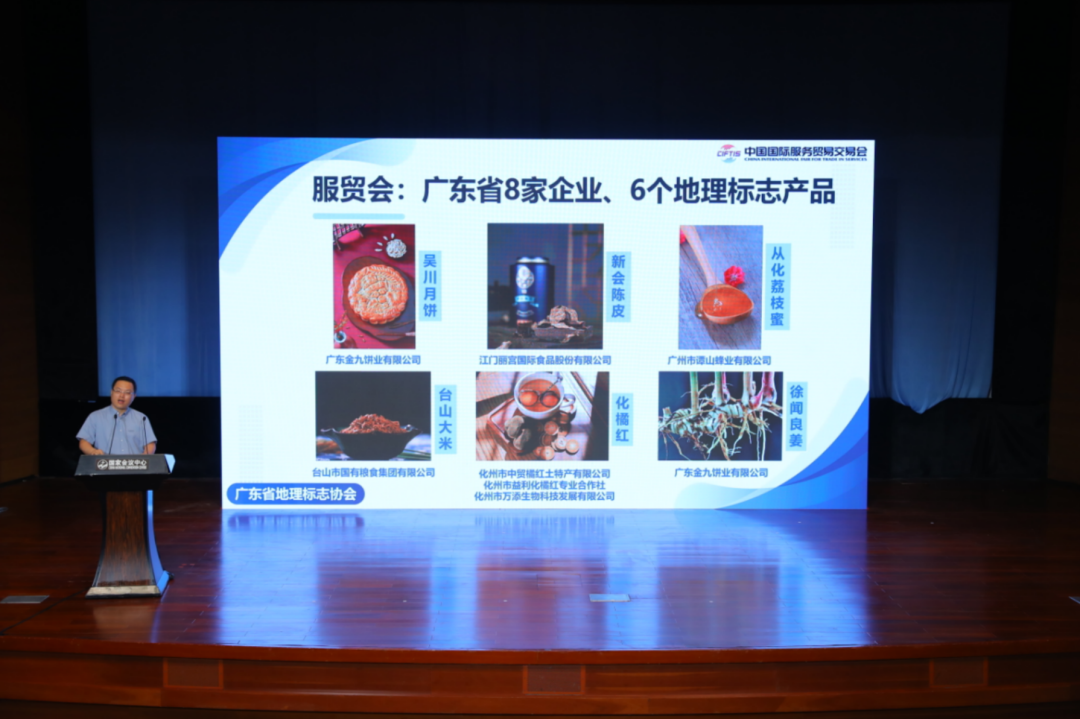 “新会陈皮、化橘红、吴川月饼、台山大米、徐闻良姜、从化荔枝蜜等6个广东省地理标志产品亮相2022年中国国际服务贸易交易会。”来源:IPRdaily中文网(iprdaily.cn)2022年9月1日-5日,2022年中国国际服务贸易交易会(以下简称“2022年服贸会”)世界地理标志品牌展在国家会议中心举办。受广东省市场监督管理局(知识产权局)委托,广东省地理标志协会组织江门丽宫国际食品股份有限公司、化州市万添生物科技发展有限公司、化州市中贸橘红土特产有限公司、化州市益利化橘红专业合作社、台山市国有粮食集团有限公司、广东丰硒良姜有限公司、广东金九饼业有限公司和广州市谭山蜂业有限公司等8家企业,带着新会陈皮、化橘红、吴川月饼、台山大米、徐闻良姜、从化荔枝蜜等6个广东省地理标志产品亮相展会。协会副会长单位代表黄贤涛先生在专题会议世界地理标志品牌分销服务大会上做广东省地理标志情况介绍。