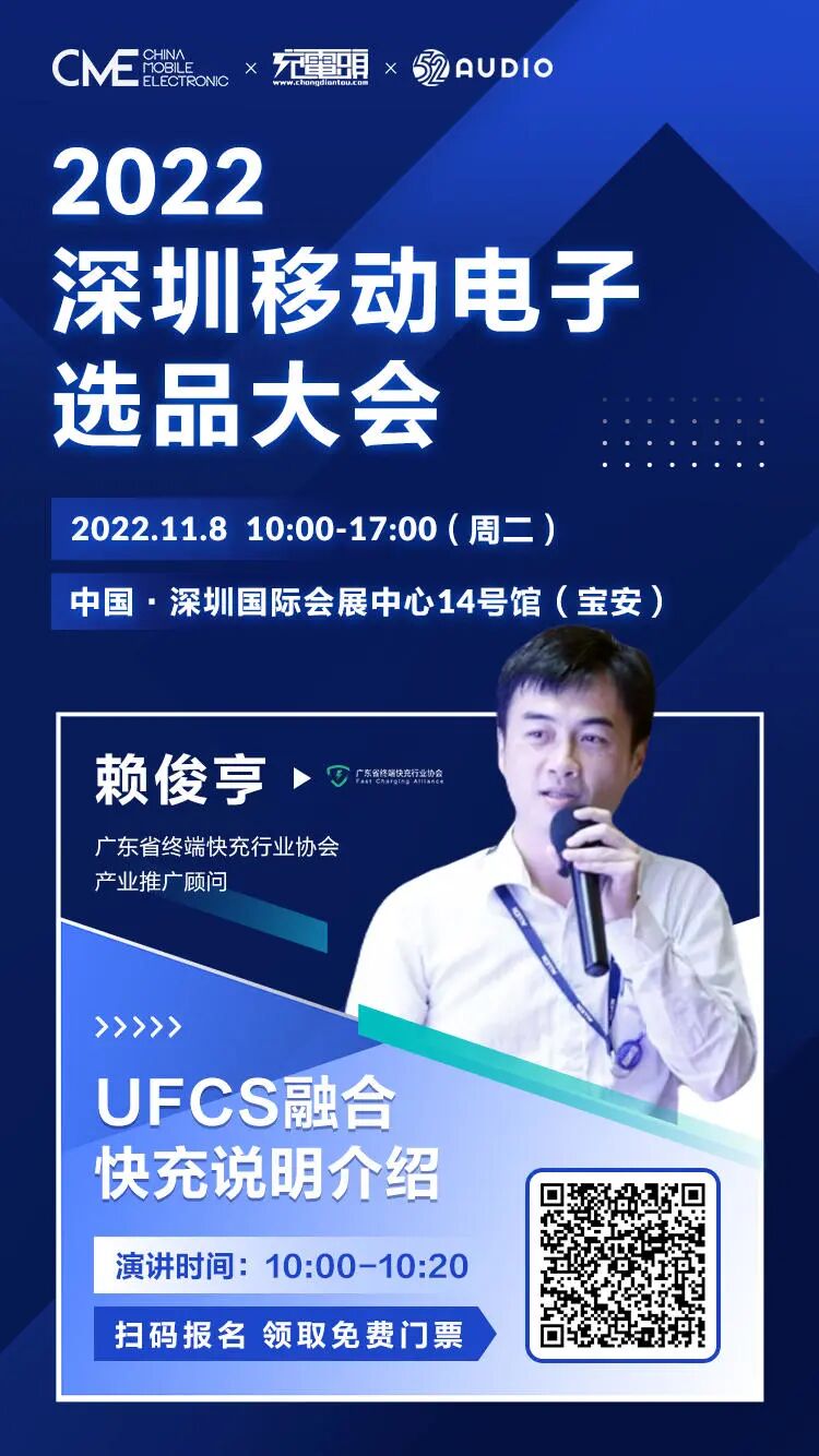 在此次选品大会中,广东省终端快充行业协会 产业推广顾问 赖俊亨先生将作为演讲嘉宾进行主题为《UFCS融合快充说明介绍》的演讲,演讲时间 10:00 - 10:20 ,主要介绍UFCS的发展历程及其应用优势,提出快充应用中可能遇到的困难点,展望UFCS协议未来发展状况。