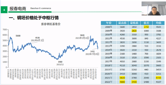 唐山报春电子商务股份有限公司大数据研究院院长孟庆增,根据长期工作经验分享了钢材价格运行逻辑,运用丰富的数据对2023钢材价格趋势进行了分析与展望,并预测了各钢材品种的价格区间。孟院长分析,从目前地产、疫情放松的速度看,明年国内对于经济增长仍有一定诉求,明年是否粗钢压减或要观望1-2季度政策落地的效果。大概率明年钢材产量还是跟随利润波动,钢厂利润仍将低位,负反馈压力仍在。