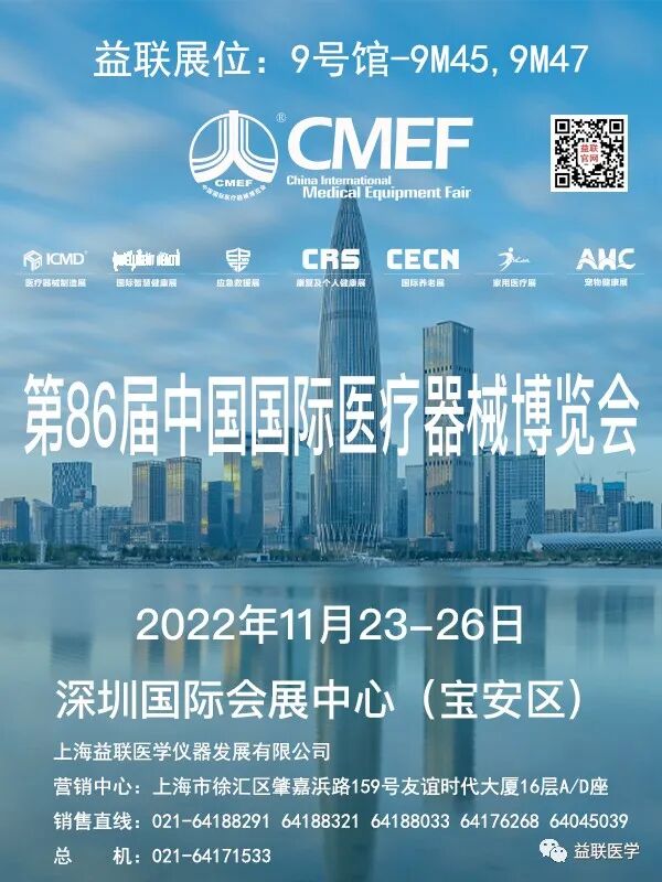 您好!2022第86届中国国际医疗器械博览会(CMEF),将于2022年11月23日至11月26日在深圳国际会展中心(宝安区·新馆)举行,上海益联医学仪器发展有限公司届时将组团参展。欢迎您的光临洽谈!
