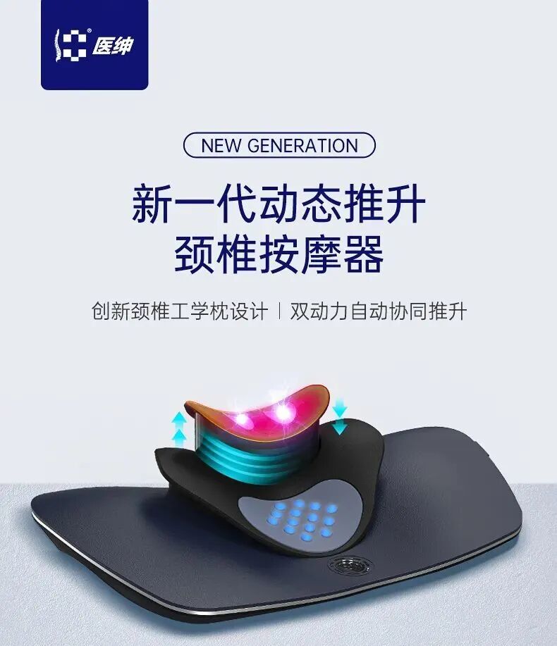 区别于传统产品, 这款颈部按摩器赋予了独一无二的推升功能,并集合了机械推升和气压推升,形成多段运动模式,可根据不同人群的需求让颈部做不同强度的训练。同时热敷和电脉冲所营造的温热酥麻环境,可以让颈部运动进行得更加舒适。