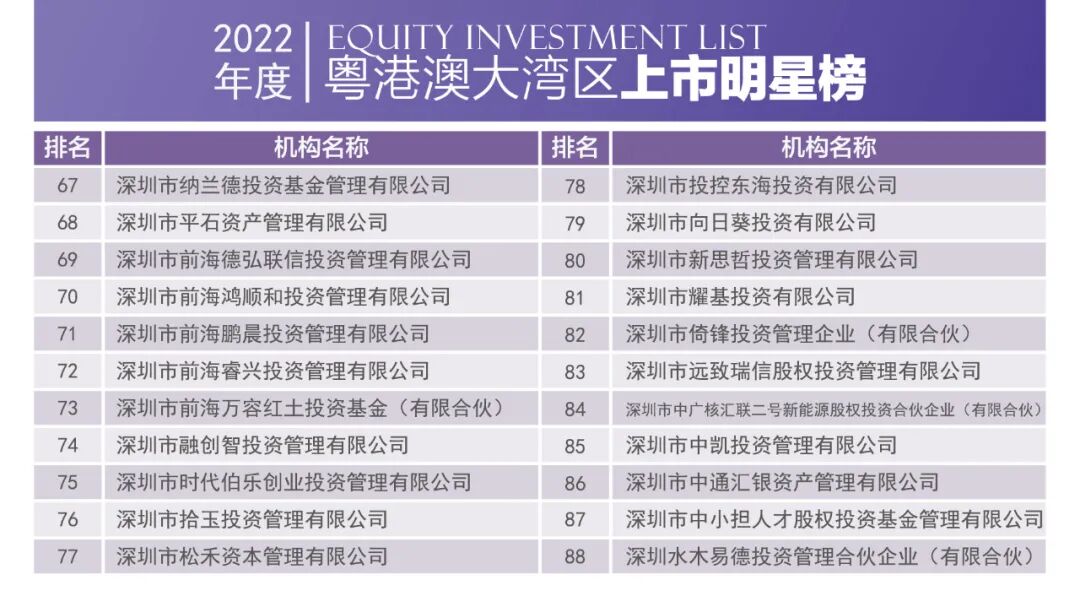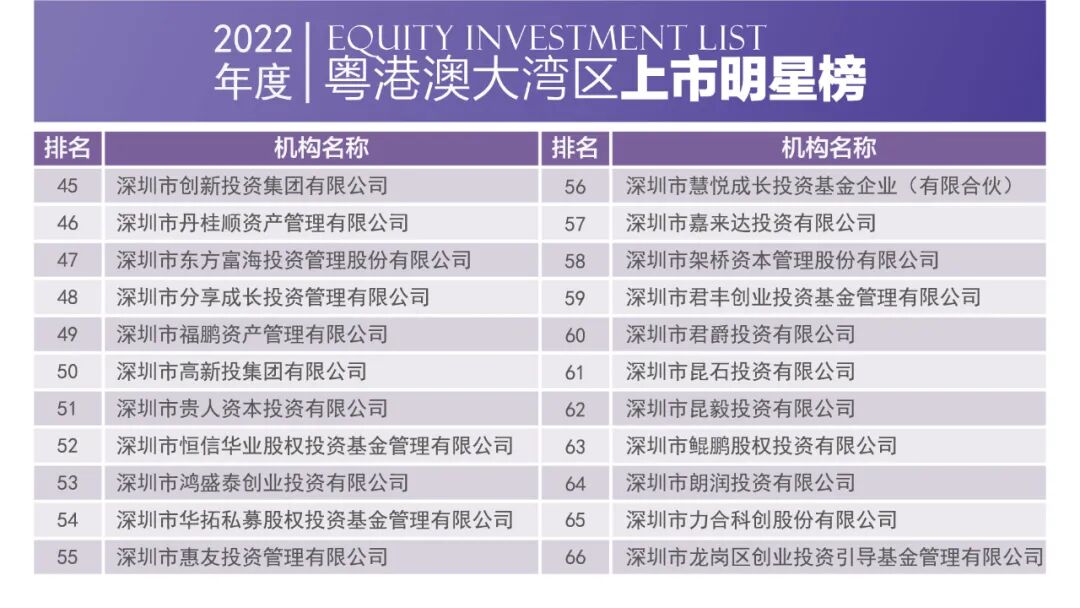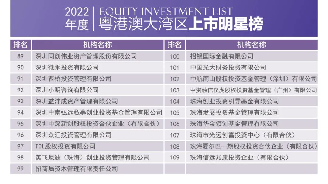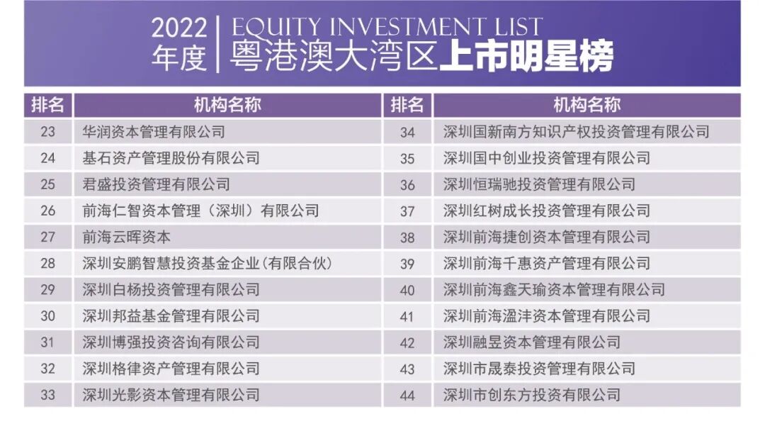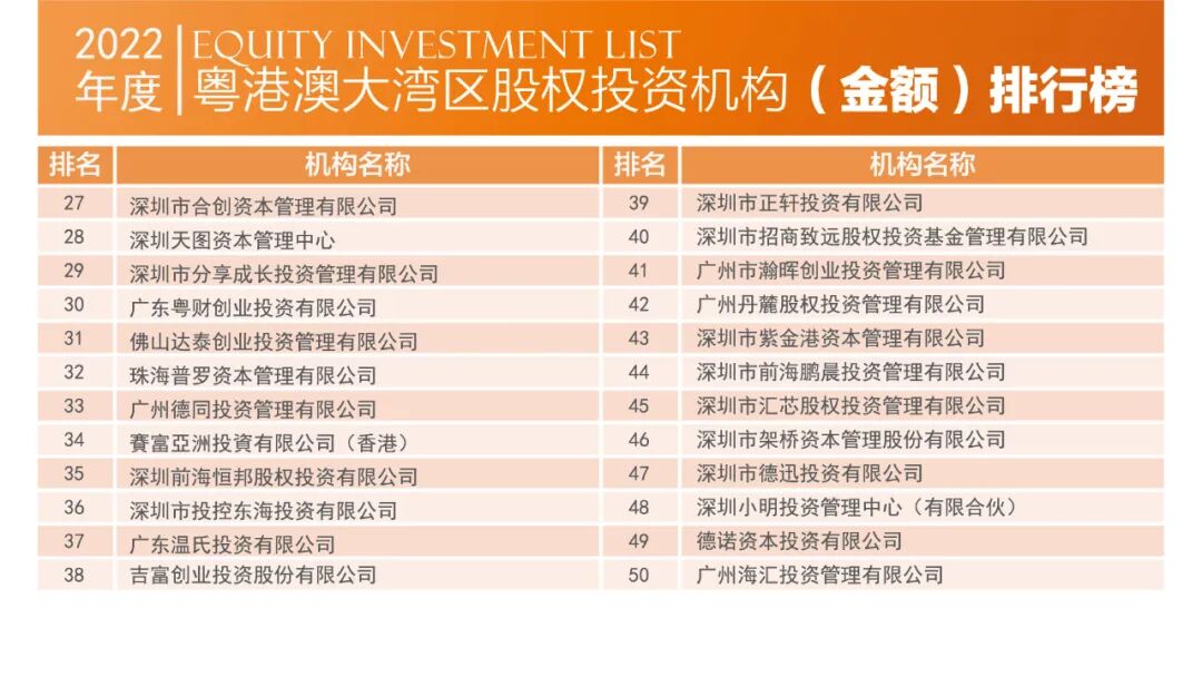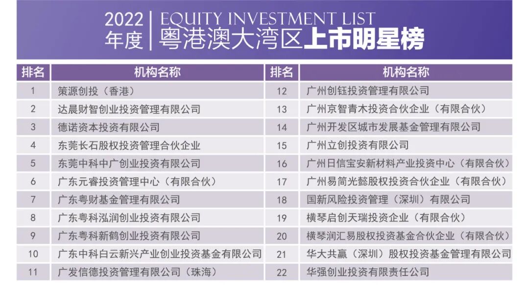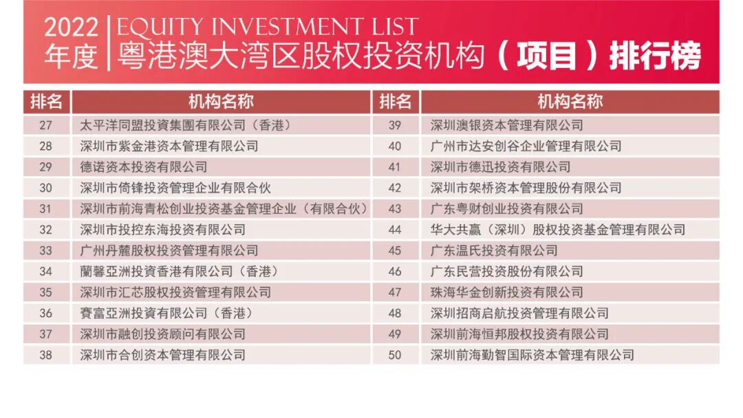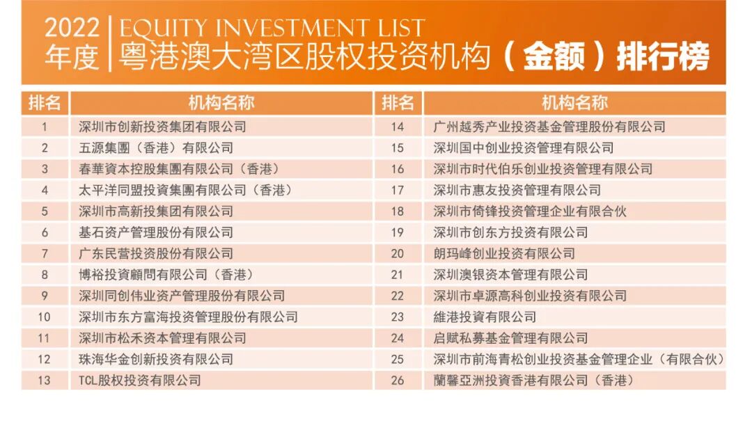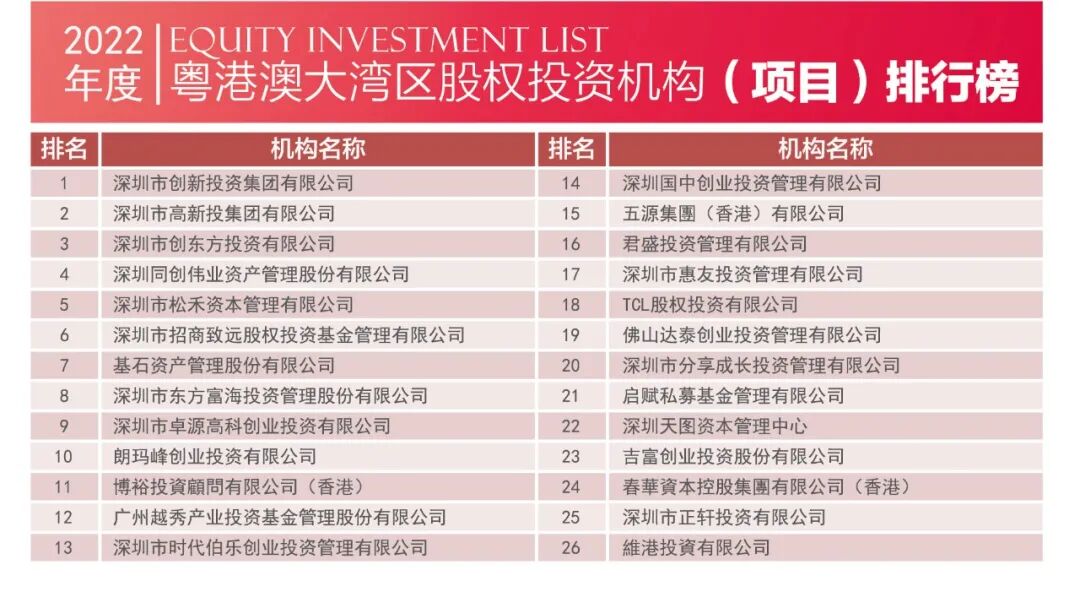 2023年4月1日,由深圳市投资商会、深港投资联盟、长城投资商学院联合主办的2022中国粤港澳大湾区股权投资榜单正式发布。