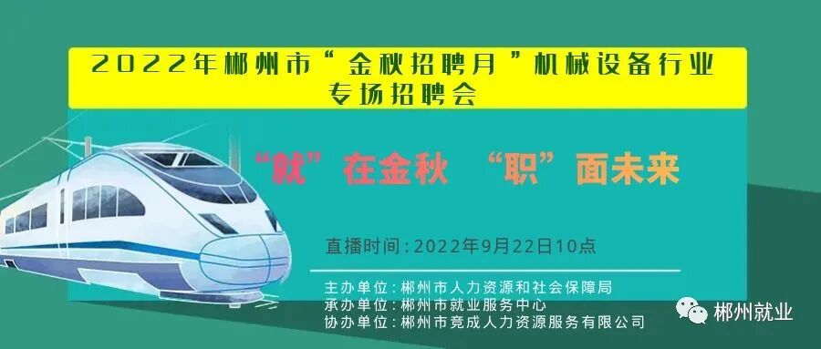 9月22日由郴州市人力资源和社会保障局主办的2022年郴州市“金秋招聘月”机械设备行业专场招聘会在郴州市就业超市举行,开播时间上午10点整。