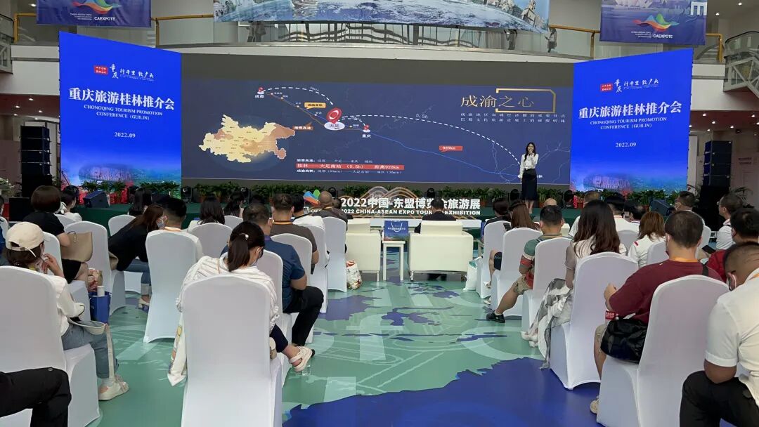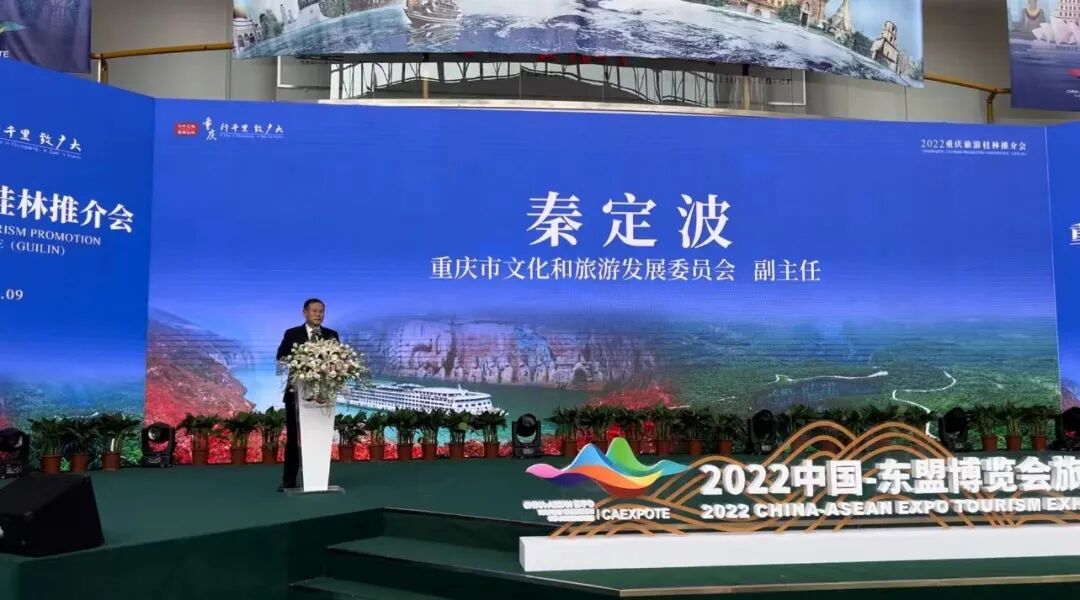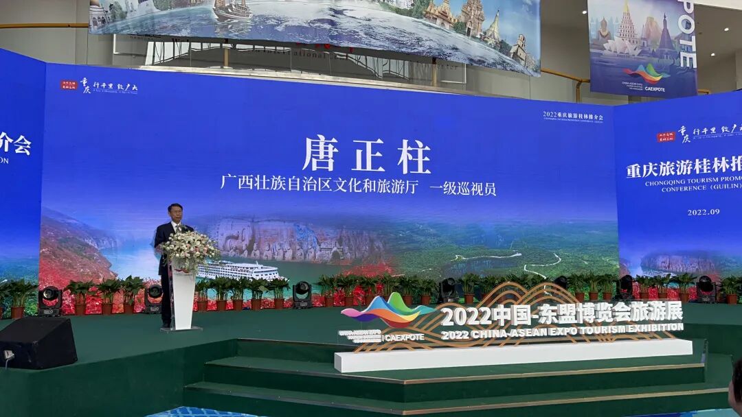 当天下午,2022重庆旅游桂林推介会在桂林国际会展中心中厅主舞台隆重举行。重庆市文化和旅游发展委员会副主任秦定波、广西壮族自治区文化和旅游厅一级巡视员唐正柱出席推介会并致辞,中共重庆市梁平区委常委、宣传部部长曹玲出席推介会并为幸运观众颁奖。秦定波副主任提到,渝桂两地山水相近,人文相亲,自然资源均富集而独特,文化艺术繁荣发展。重庆与南宁同为澜湄旅游城市合作联盟13个首批中方会员城市之一;重庆武隆喀斯特、南川金佛山与广西桂林、广西环江同属世界自然遗产—中国南方喀斯特的重要组成部分;重庆申报的川剧《江姐》和广西申报的新调剧《新刘三姐》近期双双斩获中国舞台艺术领域最高荣誉—文华大奖。希望渝桂两地进一步开展政策互惠、品牌互推、客源互送,共促两地旅游大发展大繁荣,共同谱写澜湄合作文化旅游新篇章。唐正柱一级巡视员提到,广西与重庆旅游资源互补性强。近年来,两区市文化旅游交流合作密切,感情深厚。希望桂渝两地进一步深化文旅交流合作,不断增强两地人民的感情,推动双方文化旅游共同发展。随后,重庆文旅推介人用“8D魔幻立体城市”“壮美长江三峡”“穿越古今武陵风光”“世界温泉之都”“热辣重庆火锅”等5个关键词带领观众认识重庆、玩转重庆、爱上重庆。梁平、大足、重庆武陵文旅融合发展有限公司分别代表“大三峡”“大都市”“大武陵”作精品旅游线路产品推介,并为嘉宾送出豪华游轮船票、火锅体验券、温泉酒店体验券、精品景区门票、精美文创产品、特色地方小吃等豪华文旅大礼包,将现场氛围推向高潮。此外,活动现场还正式上线“约惠重庆”重庆文旅消费周线上营销活动,旨在吸引更多海内外游客到重庆“打卡”游玩,此举也是疫情常态化防控背景下重庆积极创新营销思路、拓展推广渠道的一次有益探索。