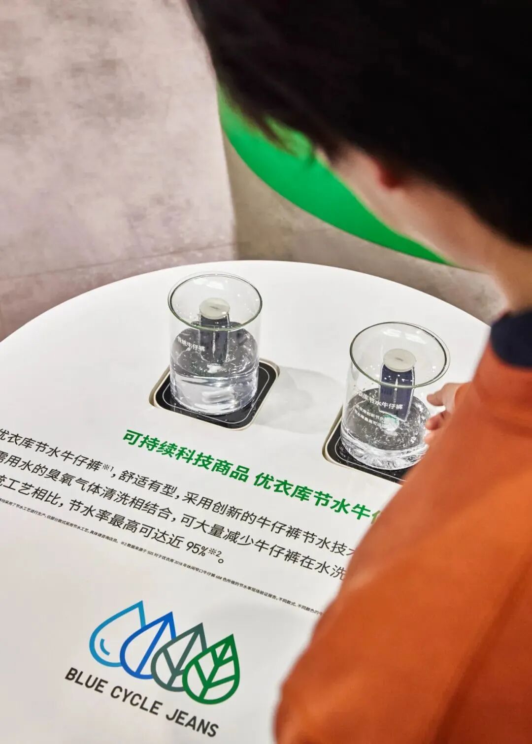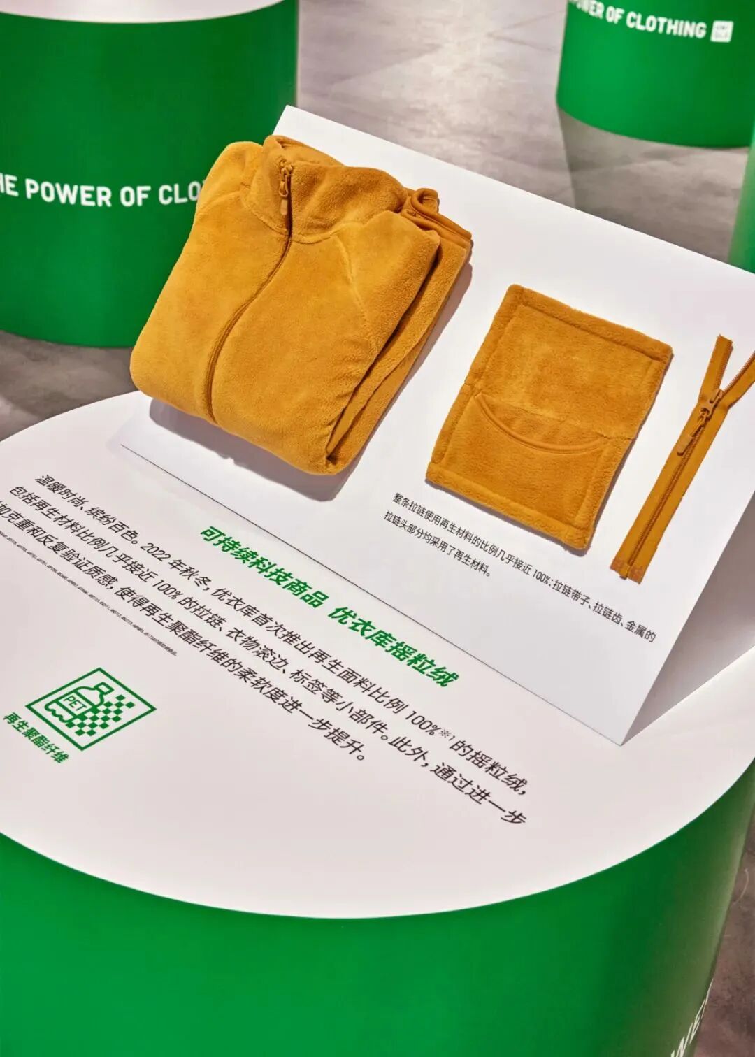不断进化的优衣库“舒适科技”无钢圈文胸则在进博会推出了轻氧Bra中国风新色“黛青蓝”,丝滑裸感,AIRism面料丝滑亲肤仿佛“会呼吸”;饱满支撑 3D轻型Bra,立体承托,展现优美胸型;稳定承托 舒适运动Bra,舒爽好穿,随心运动少负担。据悉,轻氧Bra是一款从中国顾客需求出发,协作开发的创新商品,共享给全球消费者。中国团队根据本地顾客需求,提出把AIRism面料做成无钢圈内衣。通过与全球总部和中国供应链协作,将高功能、好品质的商品推向全球,在中国上市一周年销量破百万。在可持续展区,优衣库在进博会展出了首次采用100%再生面料的摇粒绒。通过设立一个巨大的互动装置,参观者转动转盘,就可以直观了解一个塑料瓶变为颗粒、颗粒变为纱线、纱线织成面料、直到最后变为一件摇粒绒成衣的过程。作为优衣库又一款经典人气产品它不仅具备了羊毛保暖的特点,而且弥补了羊毛材质的缺点,重量更轻、质地更亲肤。历经28年时间的持续设计与进化,优衣库在今年推出了超15大新款,多样色彩,造型多变,帮助消费者点亮冬日穿搭;其面料进化轻柔暖,经典摇粒绒毛绒长且密实,延续温暖。防风摇粒绒用超薄防风层硬核阻隔冷风,赋能畅享户外生活。值得一提的是,今年优衣库还推出了16款采用100%再生面料的摇粒绒,包括拉链、衣物滚边与标签等小部件都采用了再生材料,在保持保暖性与时尚性的同时更环保。此外,再生面料技术被广泛应用到裤装、茄克、女装休闲西装、针织衫、开衫等近60款丰富商品品类中,将可持续惠及更多消费者,从一件可持续科技商品开始,爱时尚 爱地球。在品质展区,优衣库推出百变潮轮廓的舒适美腿牛仔裤,并向消费者展示了节水牛仔裤。从2016年开始,优衣库母公司迅销集团以“改变牛仔服的价值”为目的,在加州洛杉矶成立“牛仔服创新中心”,以牛仔裤的面料、版型和环保作为研究课题,开发出领先的节水牛仔服装制造技术,助力社会可持续发展。在耗水最大的牛仔裤水洗环节,优衣库开发出创新的纳米泡泡和臭氧清洗相结合的创新节水技术,取代将牛仔裤浸在水里进行洗涤的方式。纳米泡泡水洗技术将少量的水雾化成纳米级的水雾,喷洒在牛仔裤上使其褪色;臭氧清洗则使用臭氧来漂洗牛仔裤,去除水中残留的蓝色染料和化学物质。优衣库在水循环利用系统上也倾注了心力:过滤后的水被循环利用。通过一系列举措,节水牛仔裤节水量与传统工艺相比,节水率最高可达近95% ,大大降低了生产过程中的用水量。目前,优衣库约50%牛仔裤采用可持续发展的创新牛仔裤节水技术,为全球产业链实现可持续发展作出巨大贡献。另外值得一提的是,今年优衣库还首次将实体直播间带入了进博会,在11月6日到11月10日期间,进博现场将联动门店与官网直播间,进行进博同款科技商品的推广。这让无法亲身到达进博会现场的广大中国消费者可以身临其境的感受进博会,同时还直接把展品变成了商品,让消费者可以直接体验进博会展品,零距离体验优衣库先进的服装科技设计。直播间、全国门店与进博会展台的线上联动,是优衣库近几年不断进行销售形式升级的优秀成果。为了探索线上线下的沉浸式直播,优衣库旗舰店每周都会进行固定的直播,通过线上平台和年轻用户沟通,同时通过直播间展示商品的设计、功能、特色、场景。在线上购买,门店提货的销售路径打通之后,优衣库还在探索将商品、服务、生活通过网络连接,提供全方位销售服务场景的可能性。从“明日博物馆”到“明日奇境”,再到“明日乐境”,优衣库展台的进化是LifeWear品牌始终聚焦“与消费者共创未来美好生活” 的集中体现。而HEATTECH“魔力”保暖内衣、五大功能高级轻羽绒、AIRism凉感衣、世界滑雪冠军合作款“智”暖衣、MARNI联名系列、无钢圈文胸、时尚缤纷摇粒绒、节水牛仔裤等创新商品,不论从展出形式还是商品本身,都是优衣库服装设计理念、制造工艺、品牌理念、可持续发展理念不断进化的重要成果。上述进化不断推动和促成了优衣库通过“LifeWear服适人生”艺术与科学融入消费者的生活需求,甚至预测消费者未来需求,从而与消费者和市场产生了更多联结和共鸣,进而引领了消费者理念和生活方式的变化,实现了优衣库品牌从单纯的“销售商品”到“输出更健康更环保生活方式”的品牌进化。正如悬挂在优衣库展台上空正中心的LifeWear经典logo所表现的,在代表品牌的红色和代表可持续发展的绿色之间切换的优衣库,必将通过“服适人生”与“可持续发展”的紧密结合,打造兼顾“可持续发展”与“事业成长”的新型产业模式,以科学的创新和艺术的进化,全心全意向所有人提供优质服装和服务,给人们的生活带去舒适、快乐和幸福感,以“服装的力量”赋能未来美好生活,实现真正的“循善向美,共续未来”。