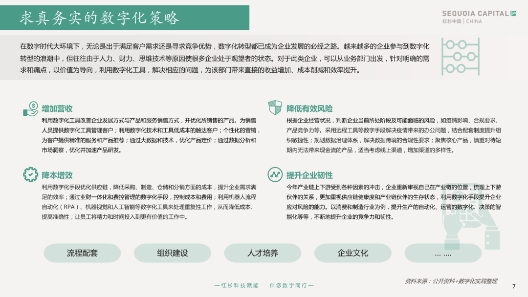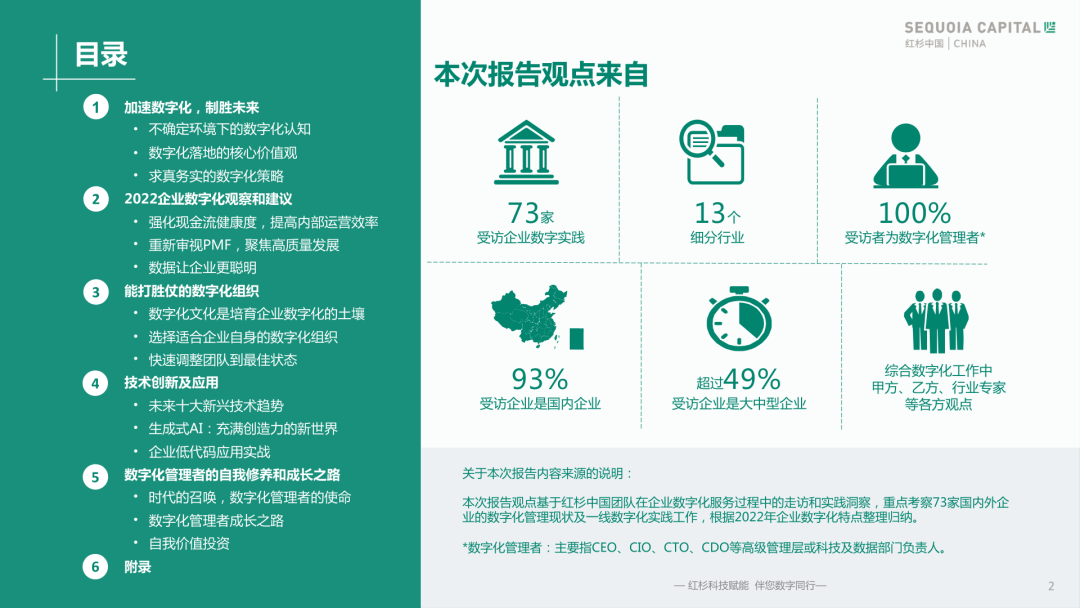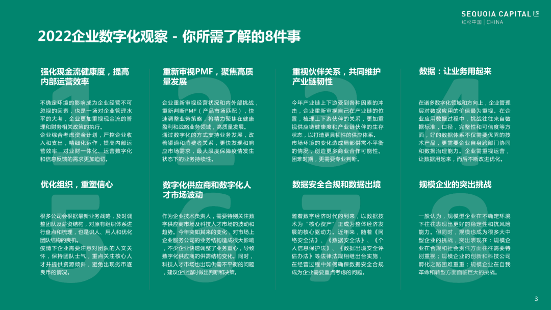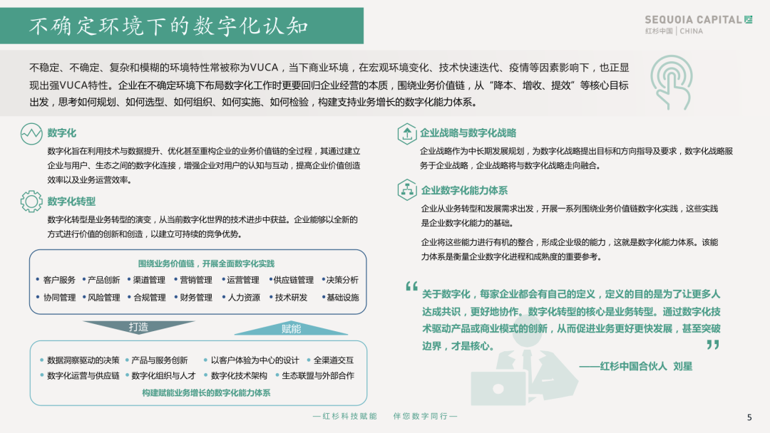 2022年是很不寻常的一年,企业的经营环境发生了显著变化,复杂、不确定、不可预测成为常态。在新常态下,野蛮生长模式转向更务实的精耕细作。同时,在诸多不确定的因素中,数字化加速推进的趋势是确定无疑的。数字化以前可能是让一些企业活得更好,而今天是很多企业生存下去的关键。每个企业必须思考数字化的升级,用新的技术来改变自己,降低企业的推广成本、渠道成本、人力成本和管理成本,受数字化转型升级带来的红利。