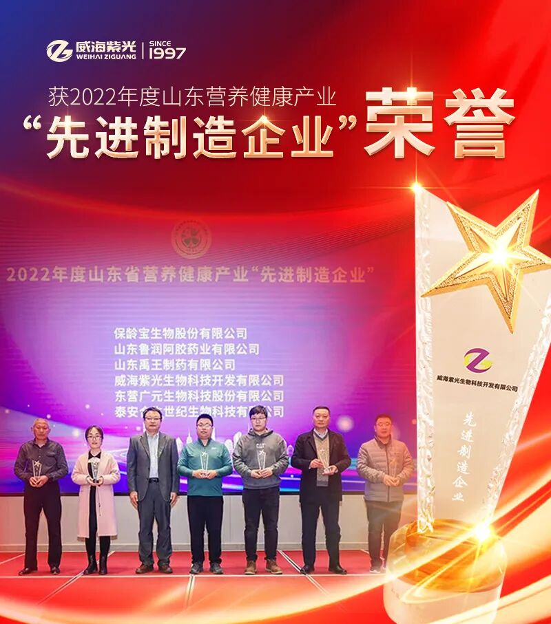 2023年3月1日,山东省营养保健食品行业协会举办第二届第二次会员代表大会暨2022年年会,威海紫光凭借过硬的生产实力和严格的质量品控,获得“先进制造企业”荣誉称号,威海紫光优健总经理李森先生代表公司接受荣誉表彰。