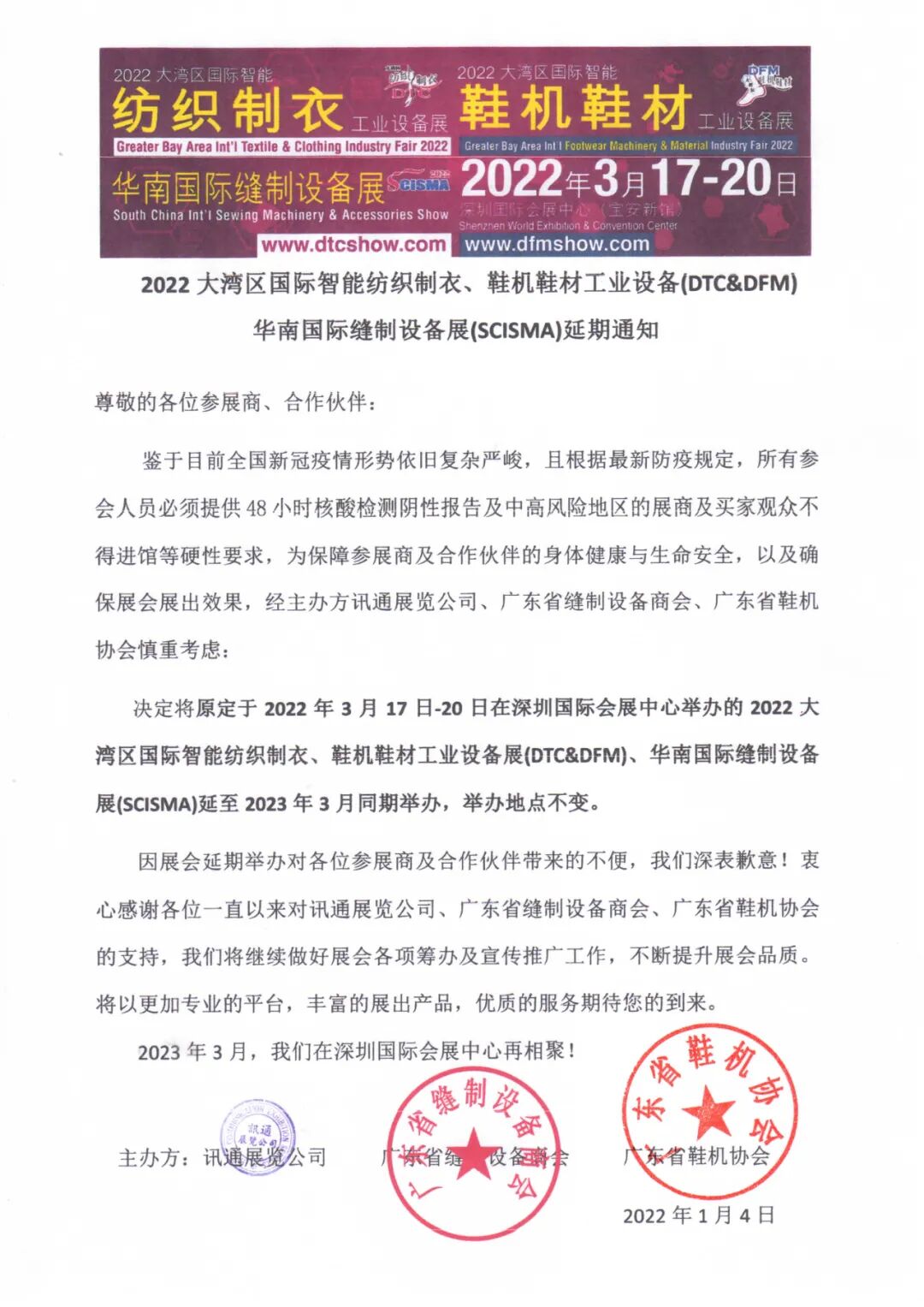 鉴于目前全国新冠疫情形势依旧复杂严峻,且根据最新防疫规定,所有参会人员必须提供48小时核酸检测阴性报告及中高风险地区的展商及买家观众不得进馆等硬性要求,为保障参展商及合作伙伴的身体健康与生命安全,以及确保展会展出效果,经主办方讯通展览公司、广东省缝制设备商会、广东省鞋机协会慎重考虑: