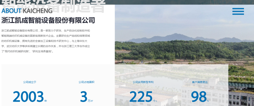 浙江凯成智能设备股份有限公司是一家致力于研发、生产自动化控制软件和智能高端纺织机械设备的国家级高新技术企业。主要研究生产捻线和络筒领域的纺织机械设备,拥有先进的全套加工设备和技术研发中心。