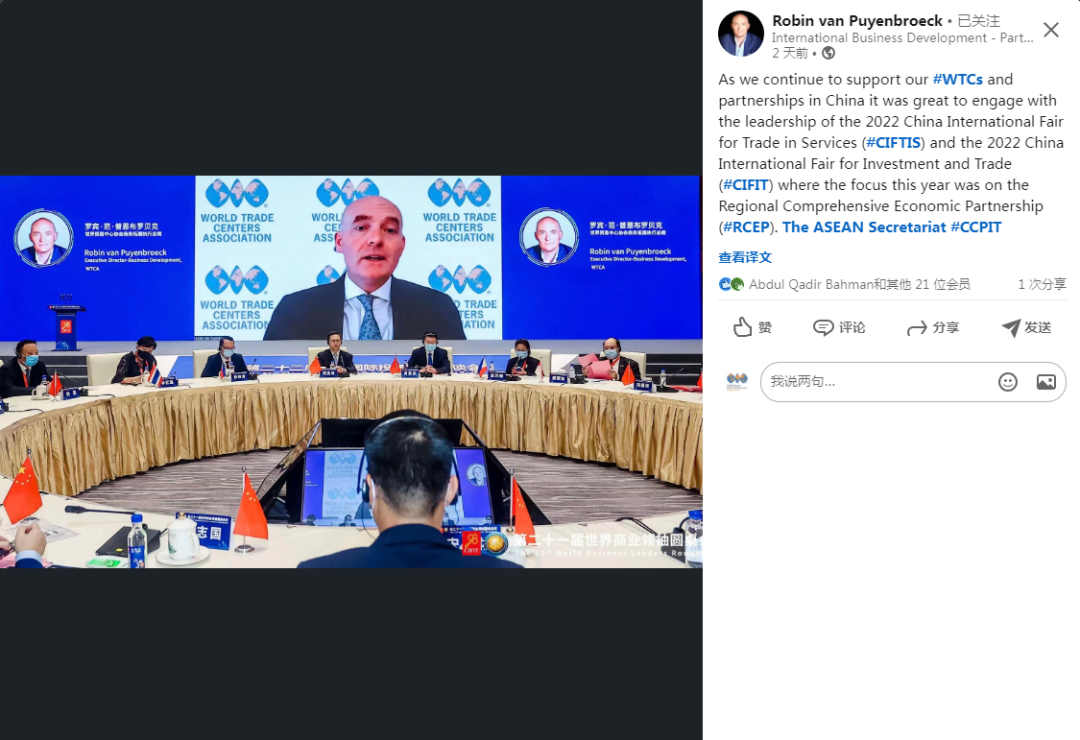 随着我们继续支持我们在中国的#WTCs和伙伴关系,很高兴与2022年中国国际服务贸易交易会(CIFTIS)和2022年中国国际投资贸易洽谈会(CIFIT)的领导层接触,今年的重点在区域全面经济伙伴关系(RCEP)。The ASEAN Secretariat CCPIT