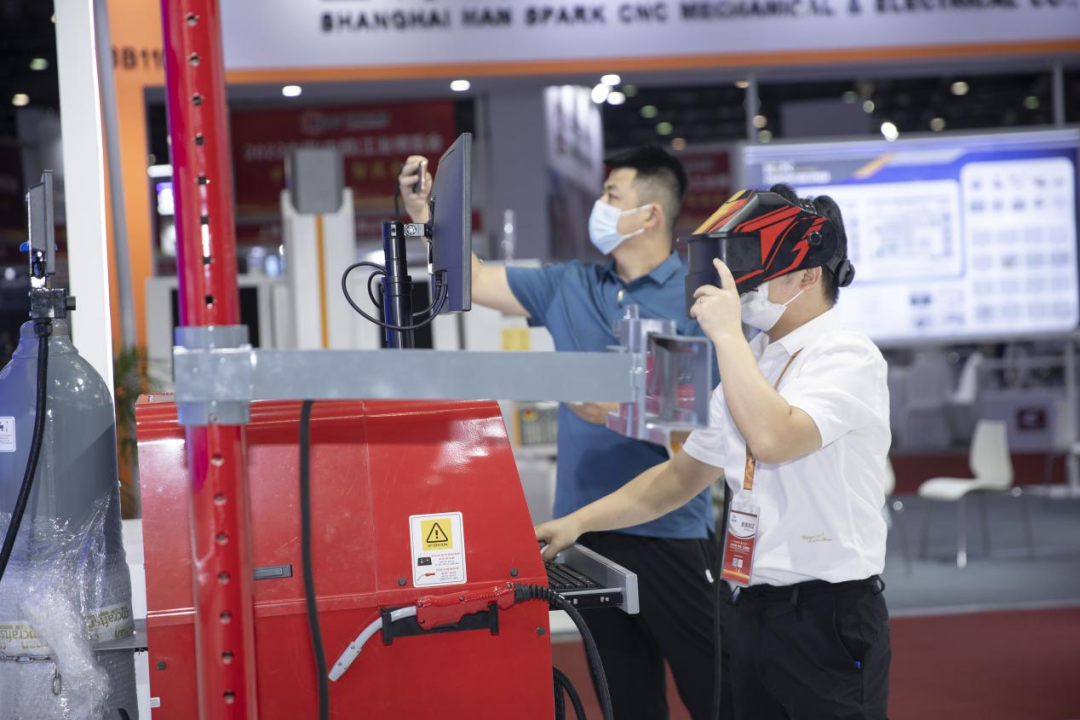 5G VR体验区极具趣味性和体验感,“VR+教学实训产品”吸引不少人参观体验,虚拟和现实相结合的焊接训练环境,全景回放焊接过程,自动生成实训数据和报告,让人们通过VR教学视频就能学会焊接技术。现场观众头戴VR设备,身临其境体验学习,切身感受到5G VR技术为制造业数字化升级带来的高效便捷。