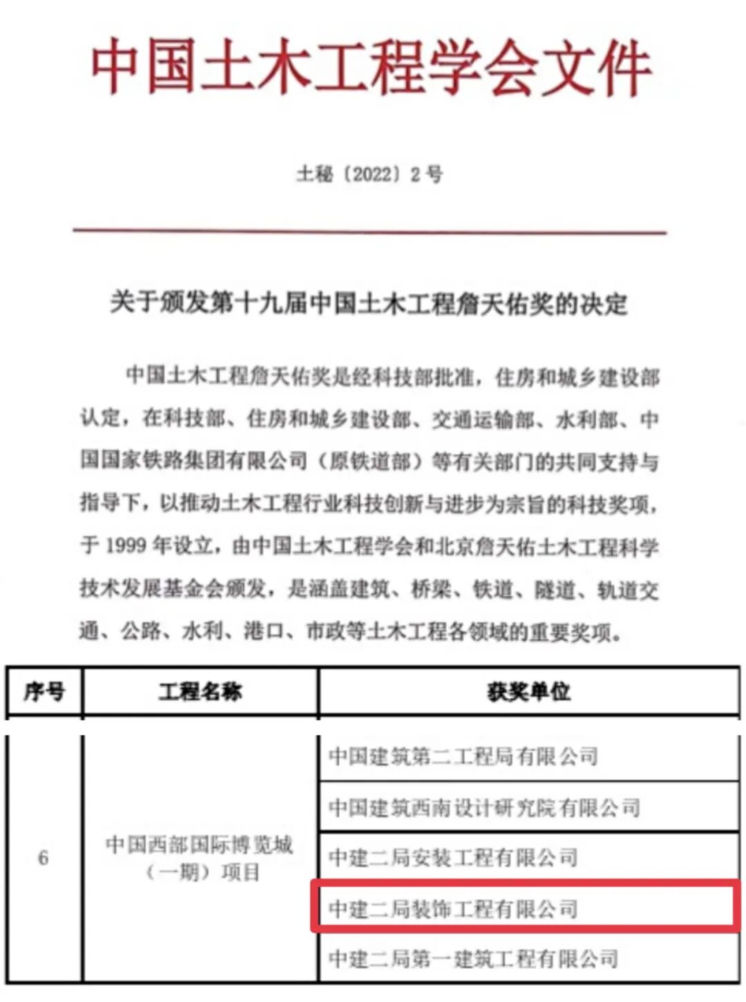 中国土木工程詹天佑奖是由中国土木工程学会和北京詹天佑土木工程科学技术发展基金会于1999年联合设立,是经国家批准、建设部认定、科技部首批核准的科技奖励项目,已经成为我国土木工程建设领域科技创新的最高奖项。