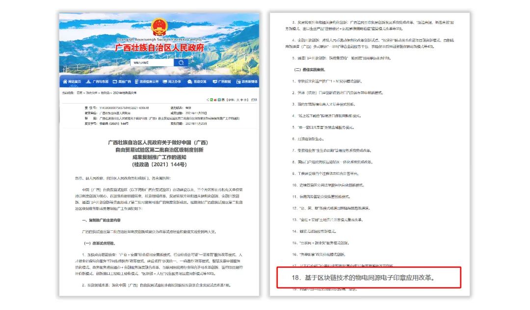 公司在中国(广西)自由贸易试验区钦州港片区落地的《基于区块链技术的物电同源电子印章应用改革》案例,被广西区人民政府评为中国(广西)自由贸易试验区第二批自治区级制度创新成果复制推广的最佳实践案例(见《桂政函〔2021〕144 号》),将由区公安厅、大数据发展局和市监局共同复制推广。
