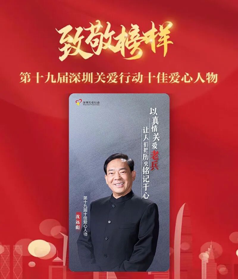 8月10日,深圳市双拥工作领导小组、市委宣传部、市退役军人事务局、深圳警备区政治工作处联合发布10名“最美退役军人”名单,公司创始人沈远彪先生荣获深圳“最美退役军人”荣誉称号。