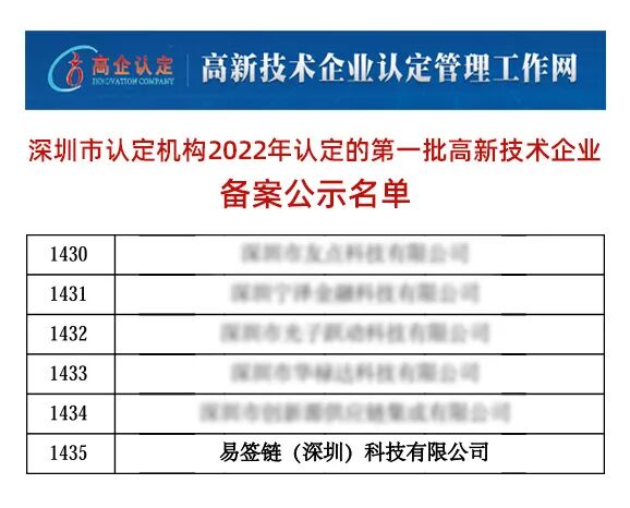 12月14日,深圳市认定机构2022年认定的第一批高新技术企业名单正式发布,易签链公司不负众望,光荣上榜,体现了易签链公司在技术研发创新领域得到官方的充分肯定和认可,公司建设发展再上台阶。