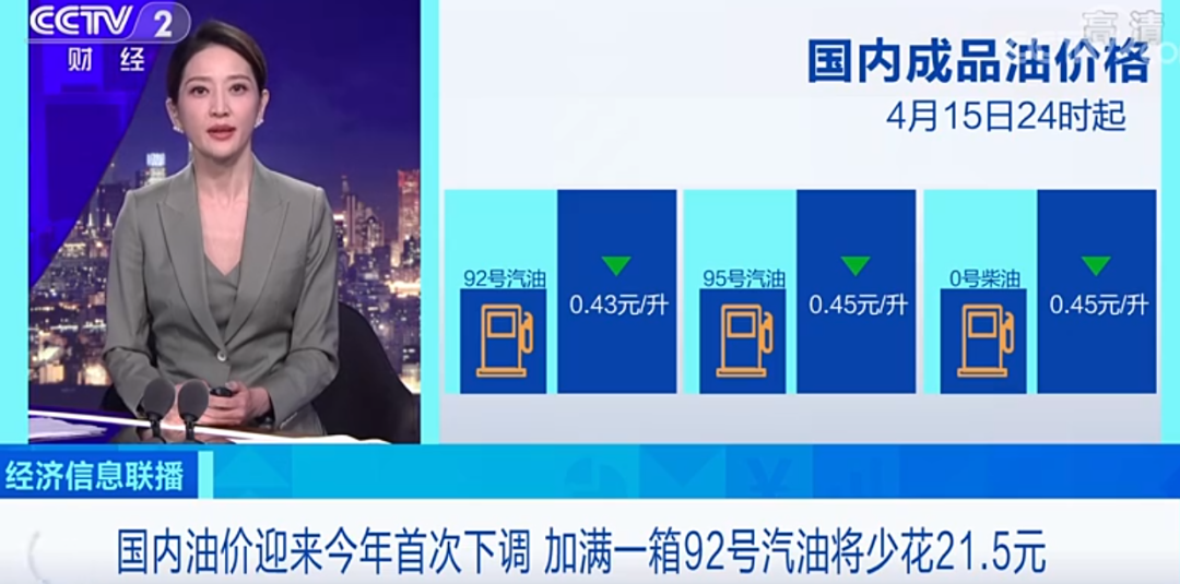 国内油价迎来今年首次下调 加满一箱92号汽油将少花21.5元国家发改委对外发布消息,从今天(4月15日)24时起,国内汽柴油价格每吨分别下调545元和530元。全国平均来看:92号汽油每升下调0.43元;95号汽油每升下调0.45元;0号柴油每升下调0.45元。按一般家用汽车油箱50L容量估测,加满一箱92号汽油,将少花21.5元。这也是今年以来国内油价首次下调。