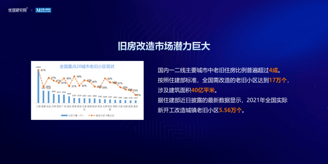 与其相关的旧房改造,国内一二线城市老旧住房比例超过四成,按照住建部标准需要改造老旧小区将近17万个,涉及到建筑面积40亿平方米。