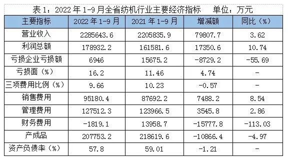 2022年1至9月,253家规模以上纺机企业中41家企业亏损,同比增加12家;亏损额6946万元, 同比减少8729.2万元,下降55.69%;规模以上企业亏损面16.2%,同比上升4.74个百分点。