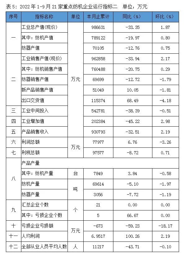 根据协会对全省21家重点纺机企业2022年1-9月主要指标统计分析,重点纺机企业主要经济指标出现较大幅度下滑。